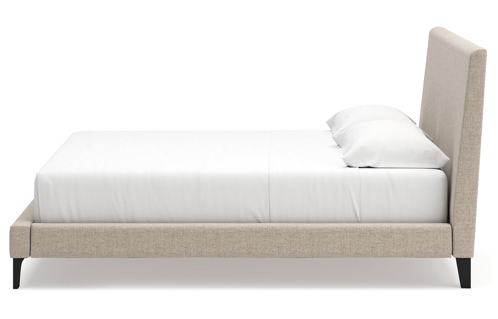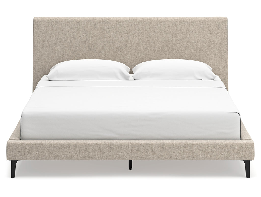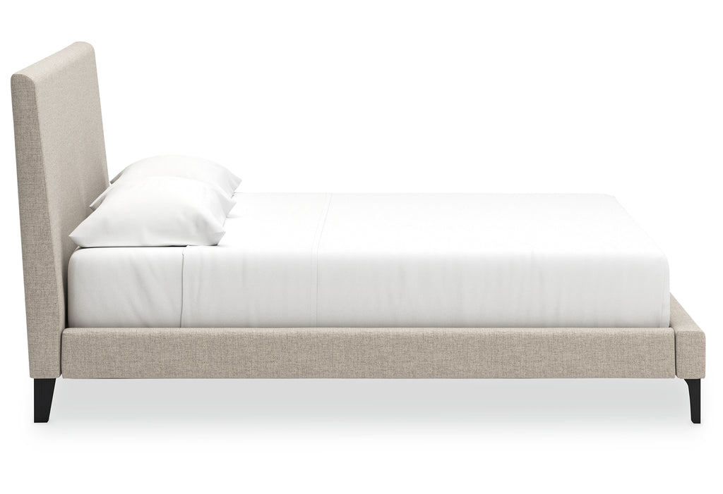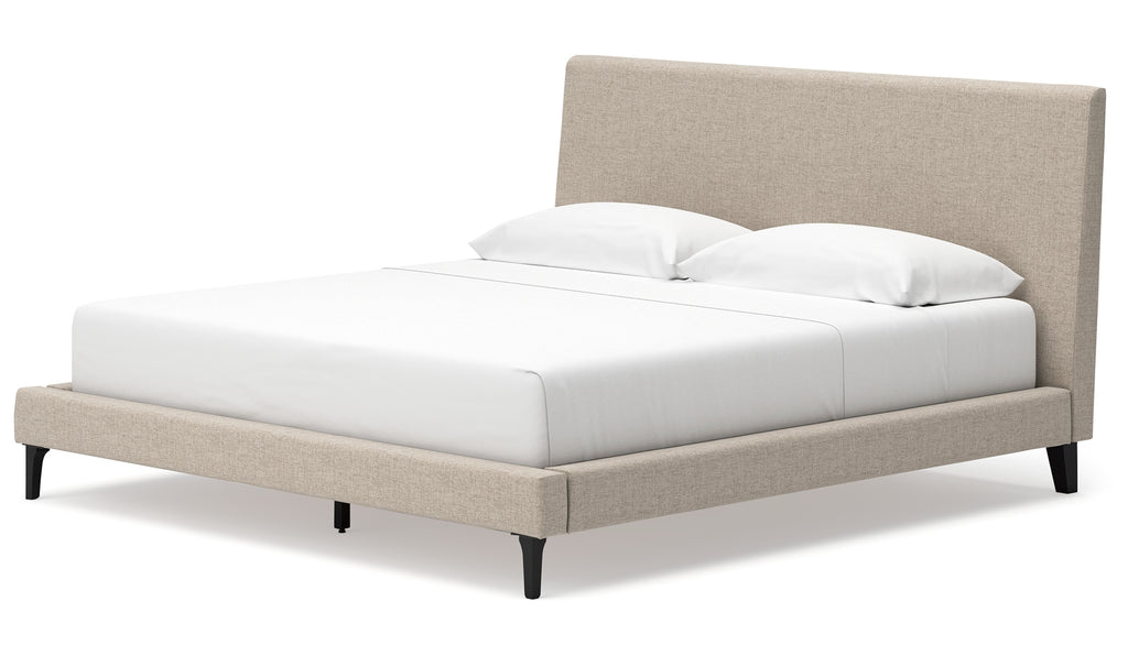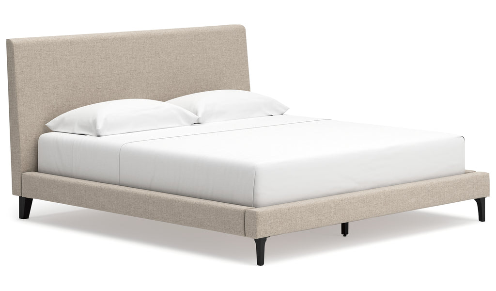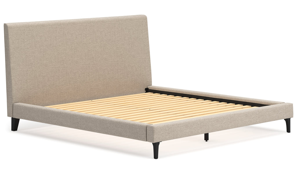 Clean-lined and contemporary—but far from stark—this king upholstered bed with roll slats is a fresh style awakening. Its sleekly simple low profile is fully dressed in a soft gray woven fabric that plays perfectly with the modern aesthetic and calming mood you long for in your tranquil retreat. | Product Features