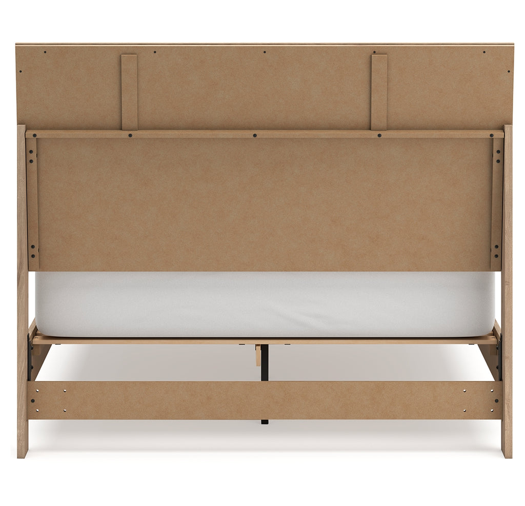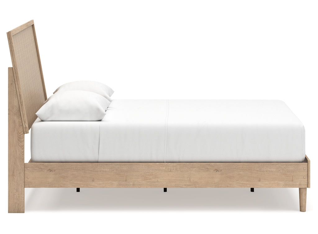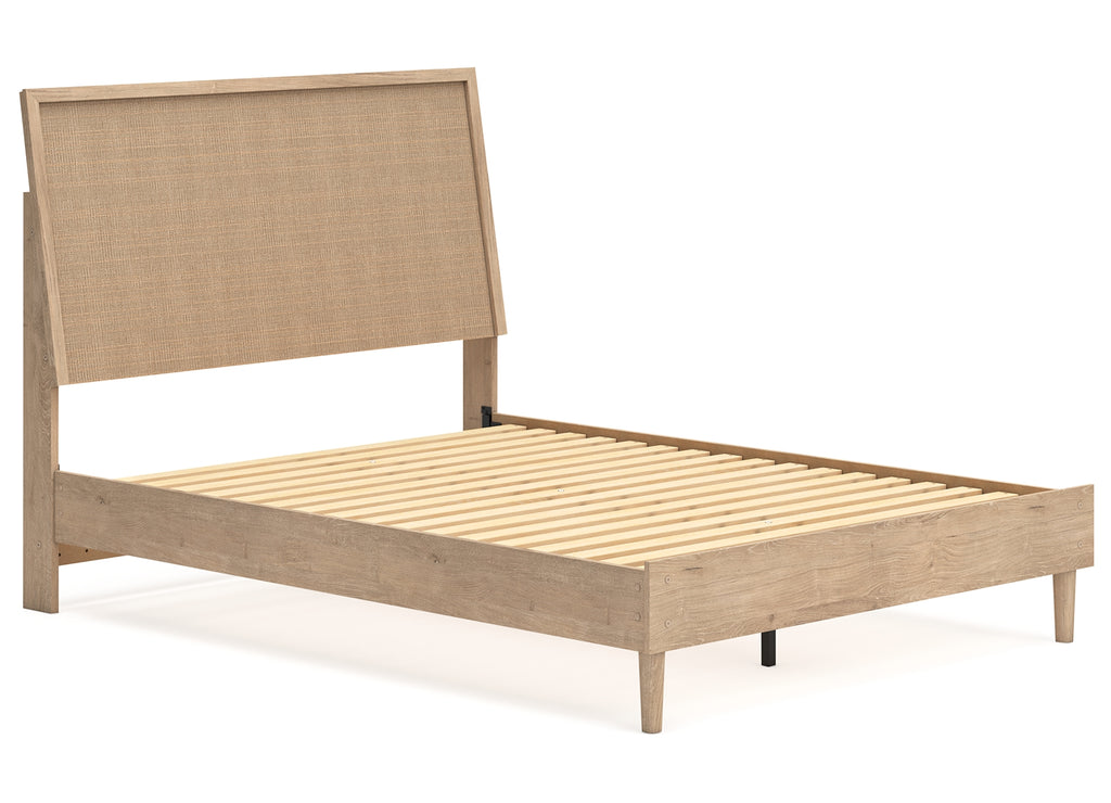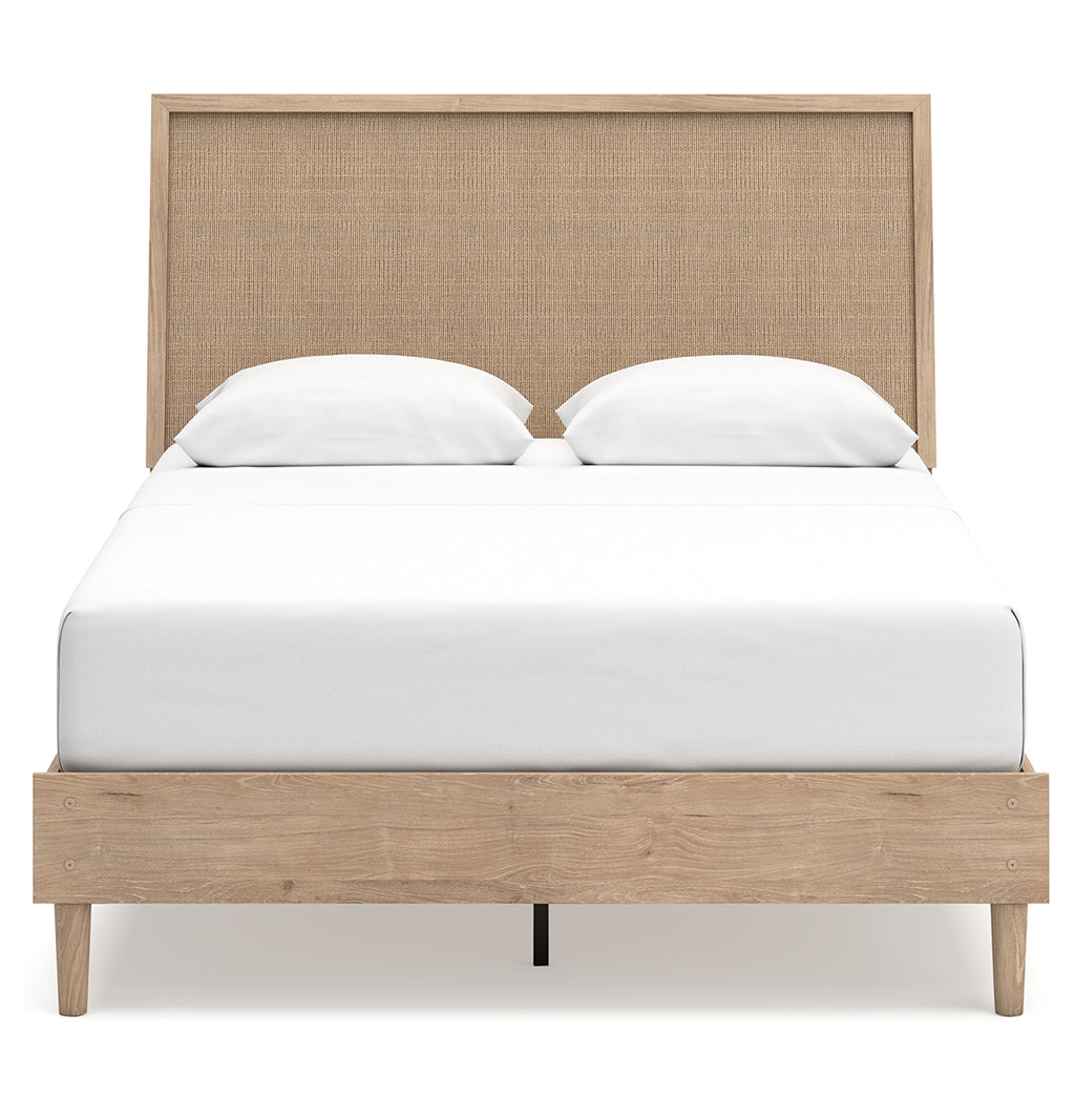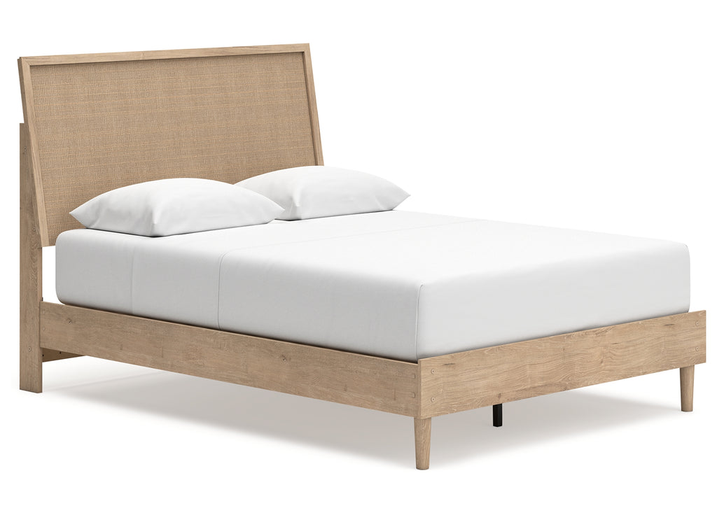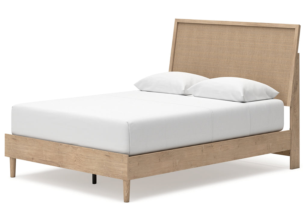 Clean-lined and contemporary—but far from stark—this queen panel bed is a fresh style awakening. Pairing a light finish with replicated oak grain and textured beige cane details, its mixed materials bring a naturally versatile vibe to your bedroom. Talk about style with added dimension. Its simplicity plays perfectly with the modern aesthetic and calming mood you long for in your tranquil retreat. | Product Features