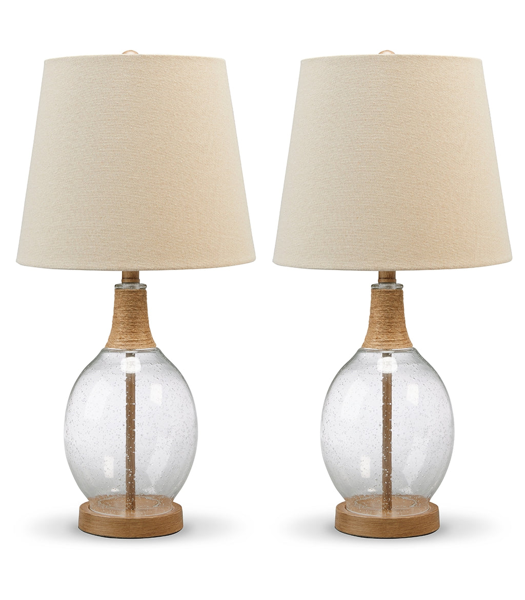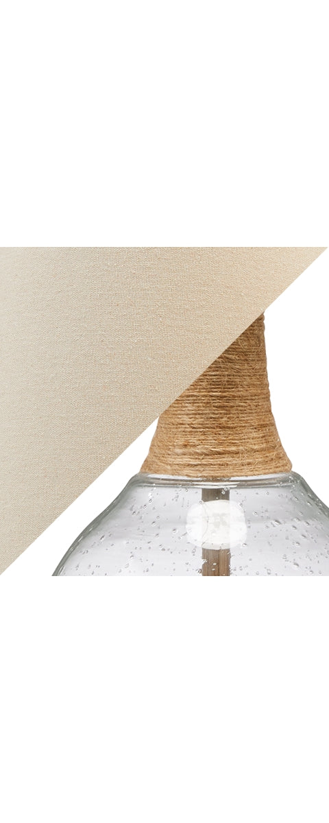 This elegant table lamp adds a timeless touch to coastal interiors. Featuring a seeded glass jar-style body with rope accents, it's the perfect piece for your bedside nightstand or living room side table. A metal circular platform base and modified drum hardback shade complete the casual look. | Product Features