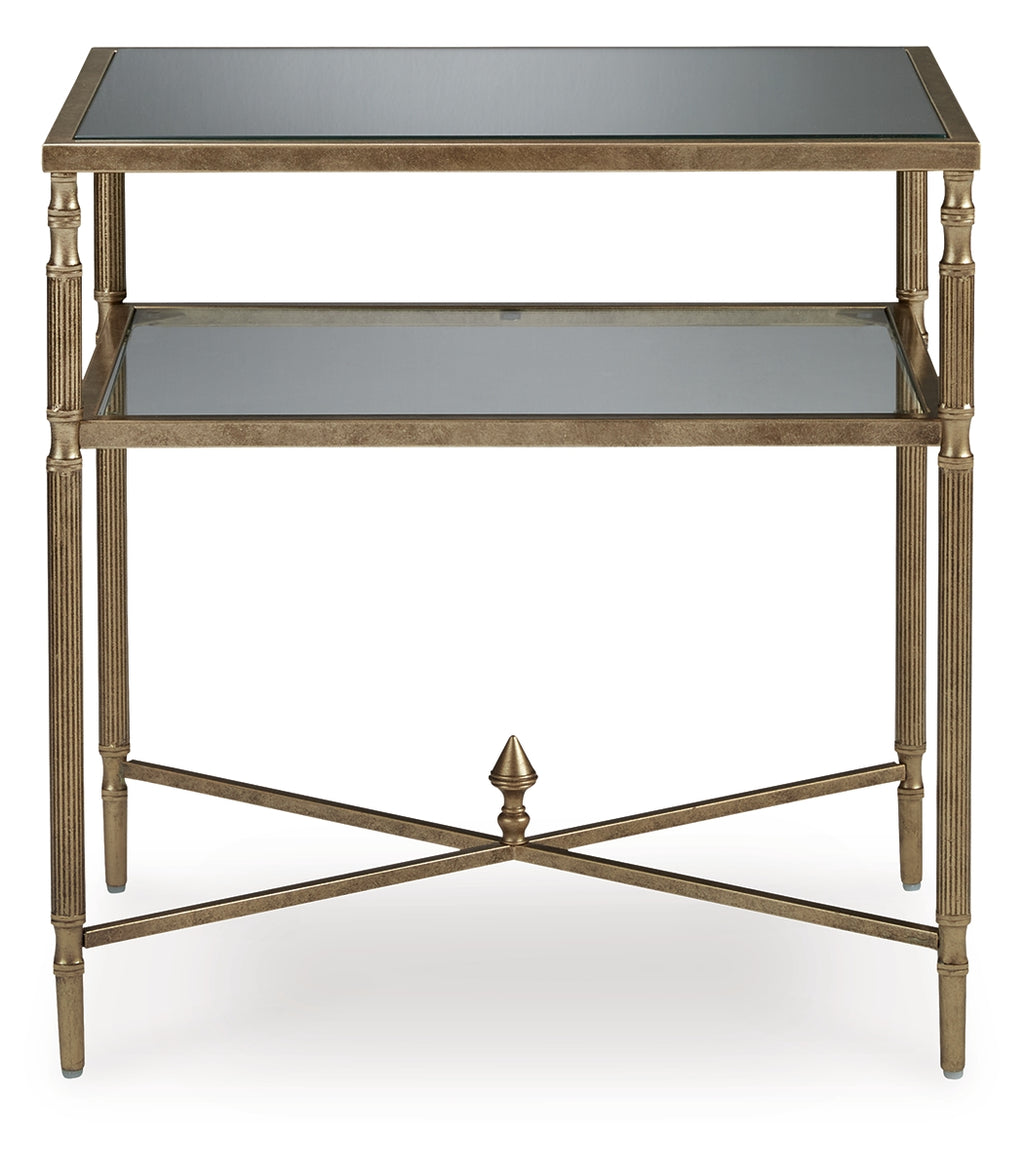 This end table gives traditional design a wonderful sense of relevance. Its details, which include embellished legs and a stretcher with a decorative center finial, are timeless classics. The aged goldtone coloration is the essence of relaxed elegance. An underlying shelf adds style, substance and functionality. | Product Features