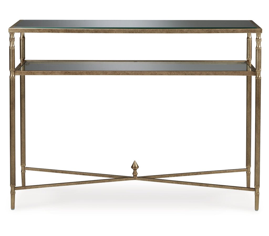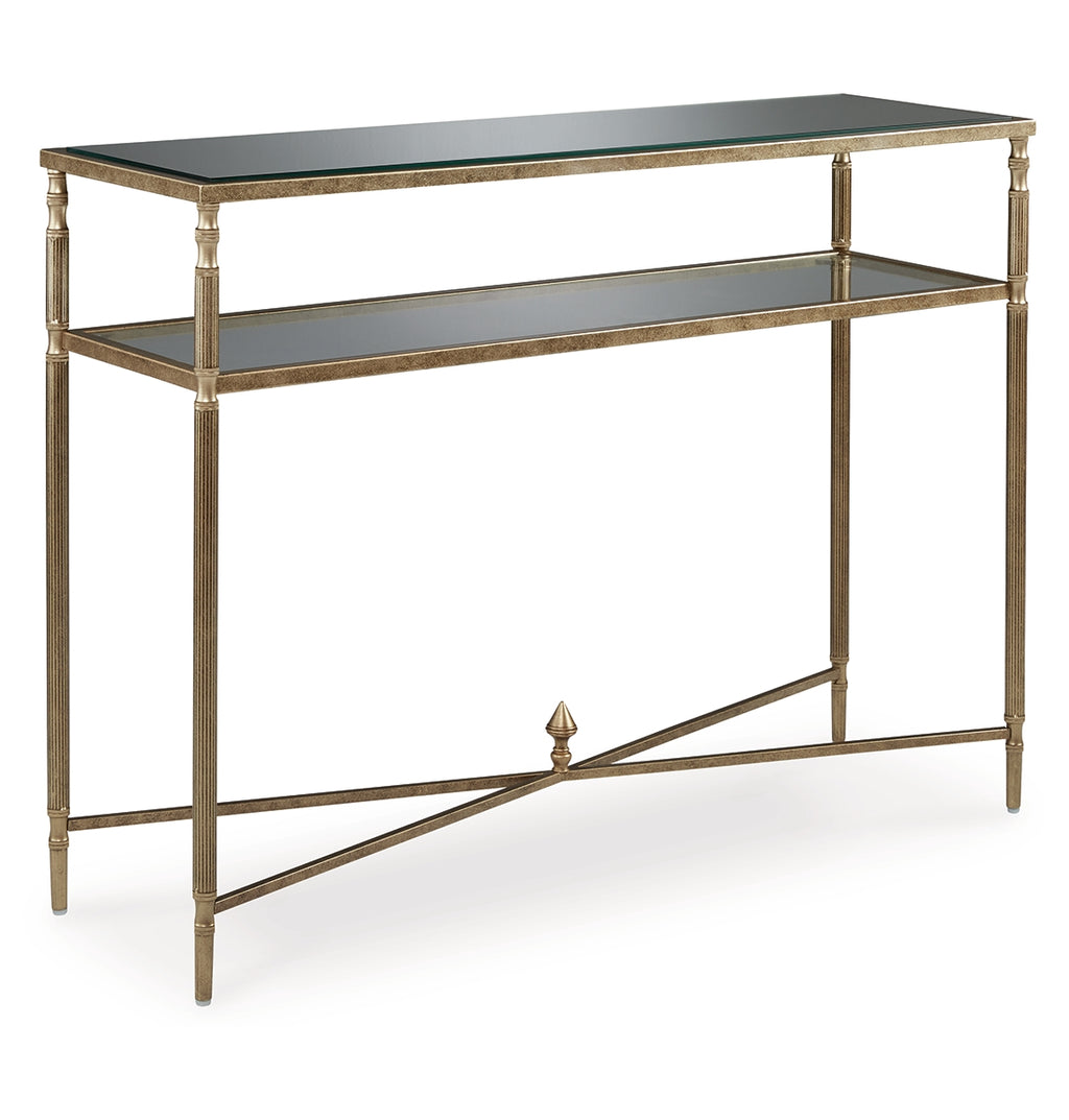 This sofa table gives traditional design a wonderful sense of relevance. Its details, which include embellished legs and a stretcher with a decorative center finial, are timeless classics. The aged goldtone coloration is the essence of relaxed elegance. An underlying shelf adds style, substance and functionality. | Product Features