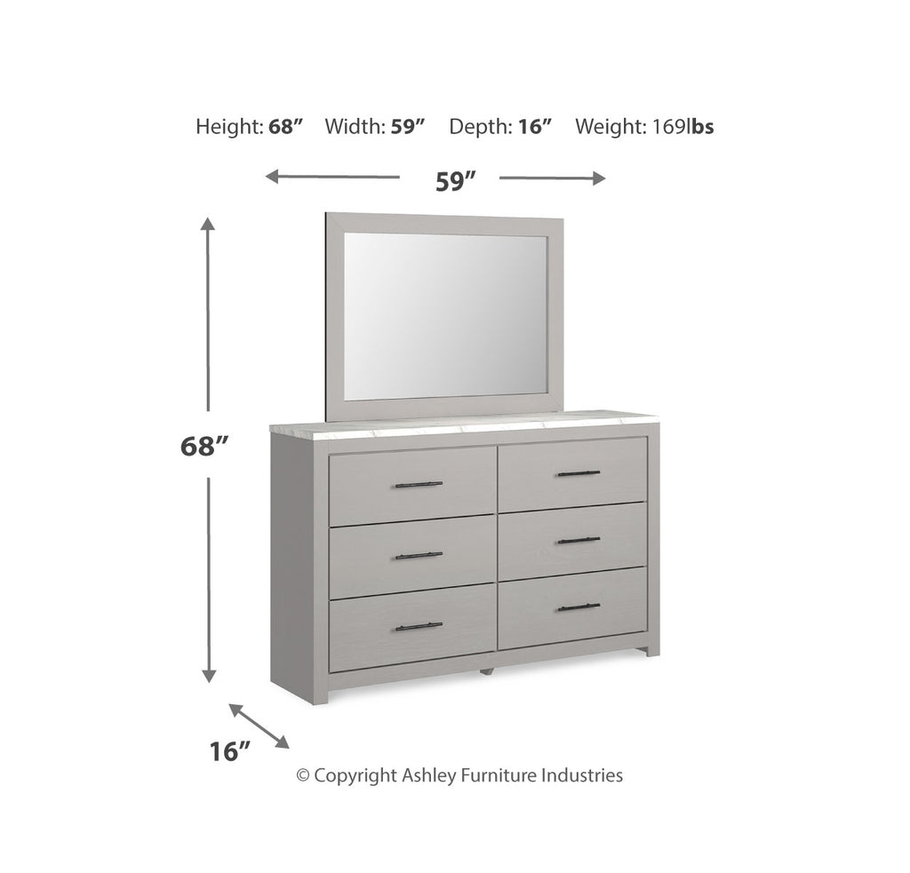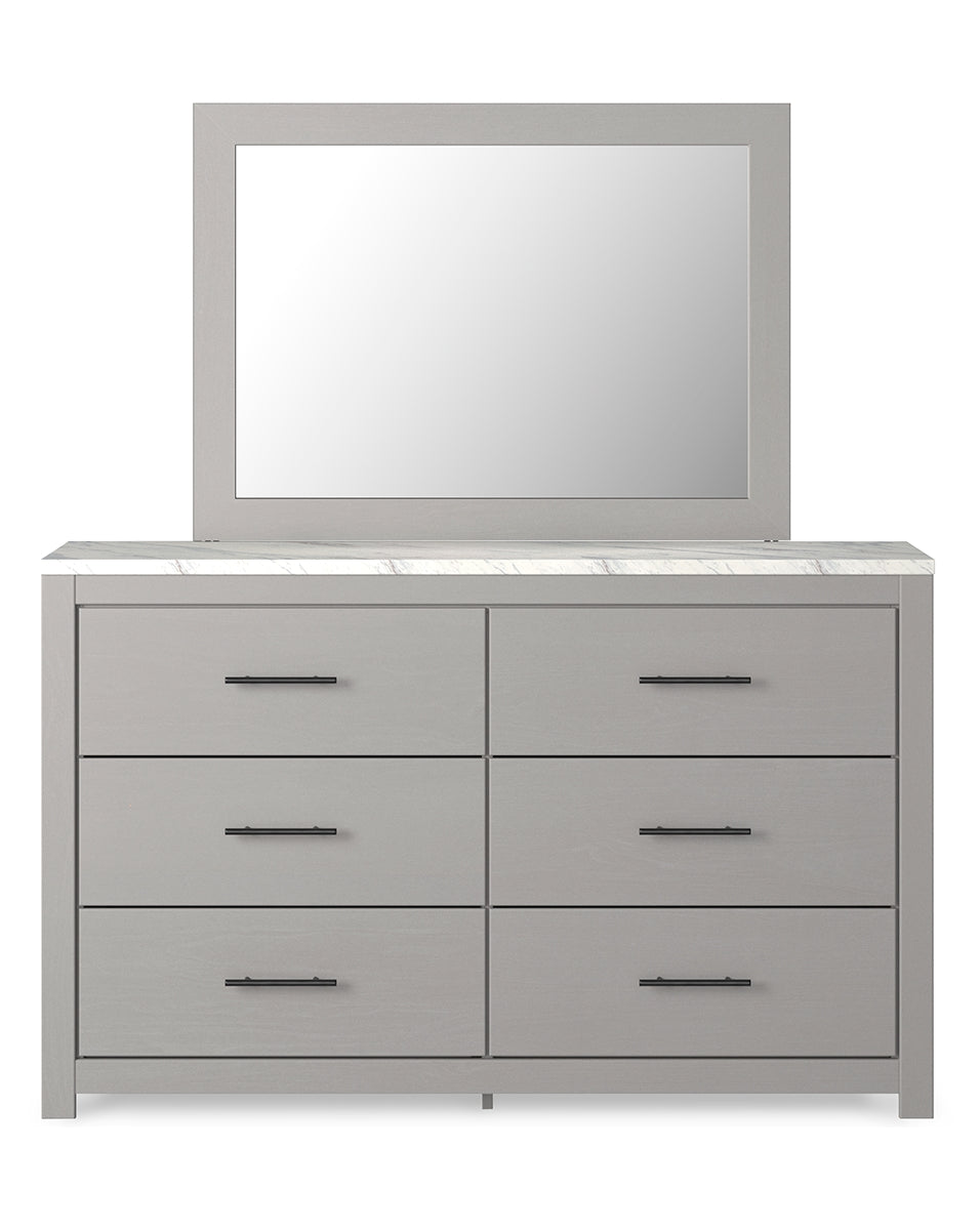 Cool, clean and casually modern. This dresser and mirror’s wispy dove gray finish and faux Calcutta marble top set the tone for your calming sanctuary. Large linear pulls add dimension and authenticity. Six smooth-gliding drawers neatly accommodate your wardrobe needs.
