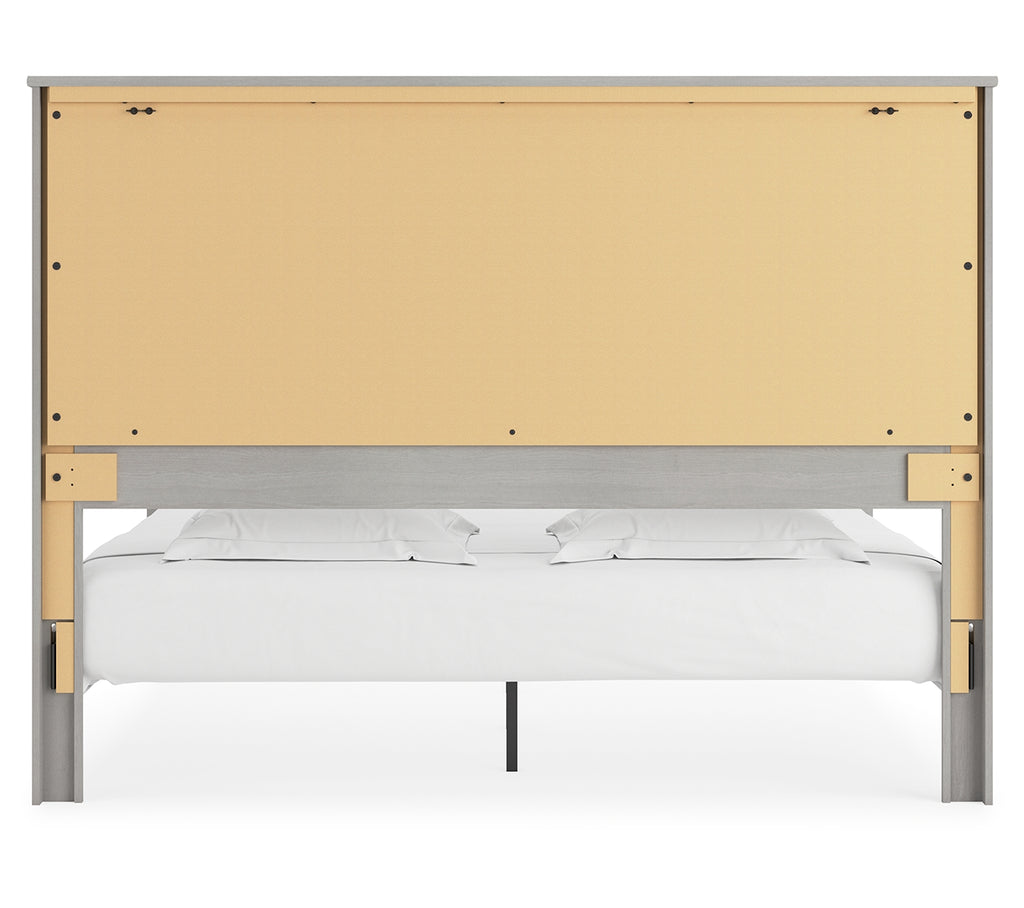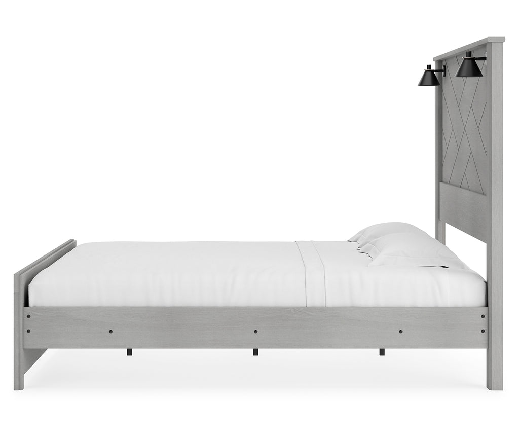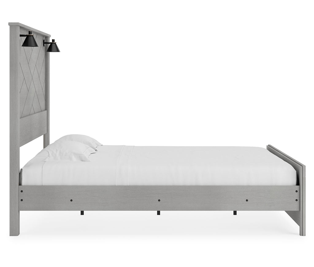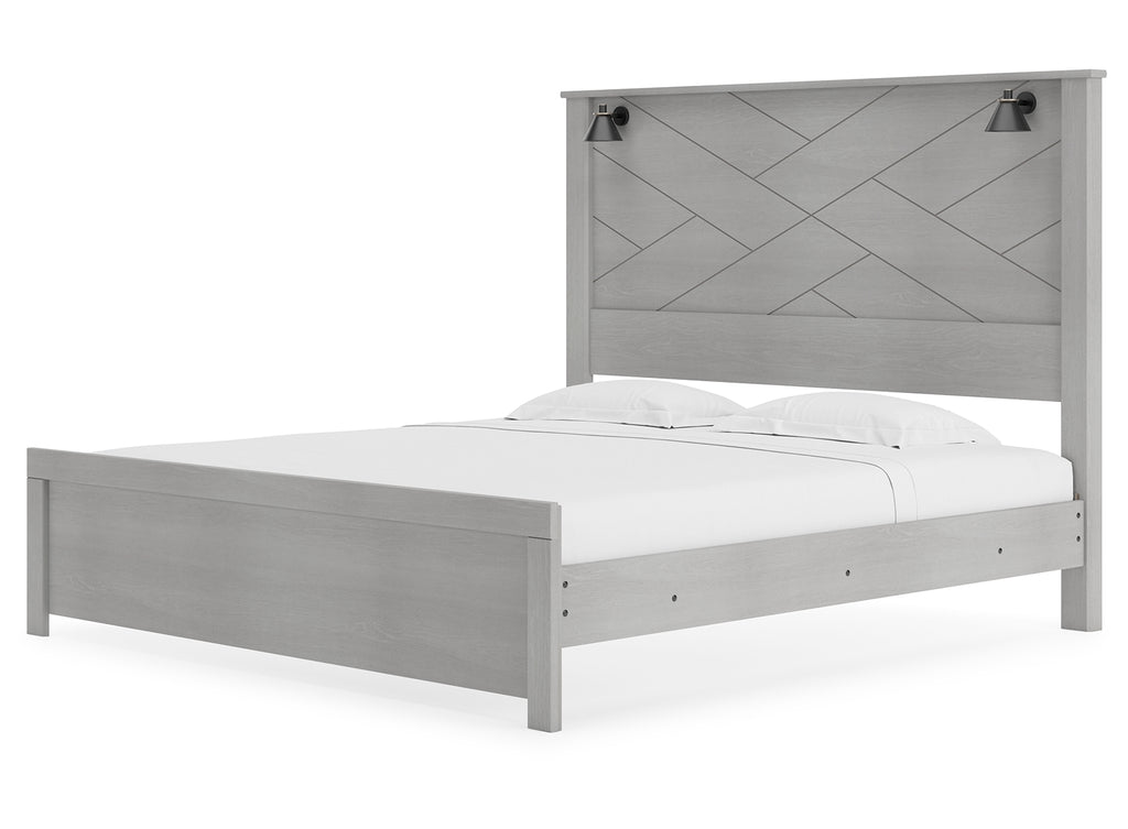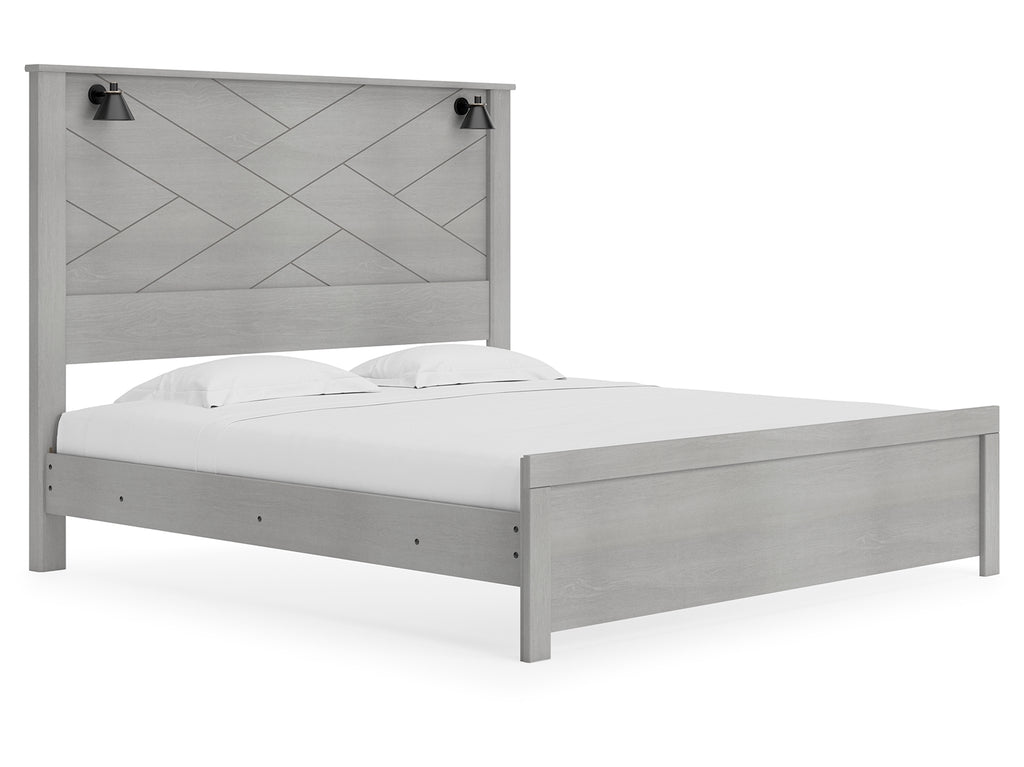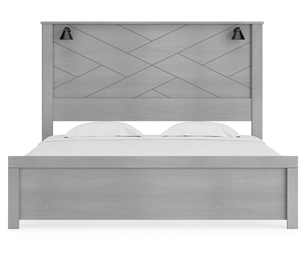 Cool, clean and casually modern. This king panel bed’s wispy dove gray finish sets the tone for your calming sanctuary. Matte black sconce lights and an abstract design on the headboard bring a fresh look to the bed’s simply stunning profile.
