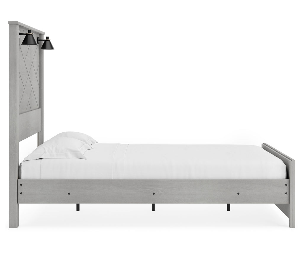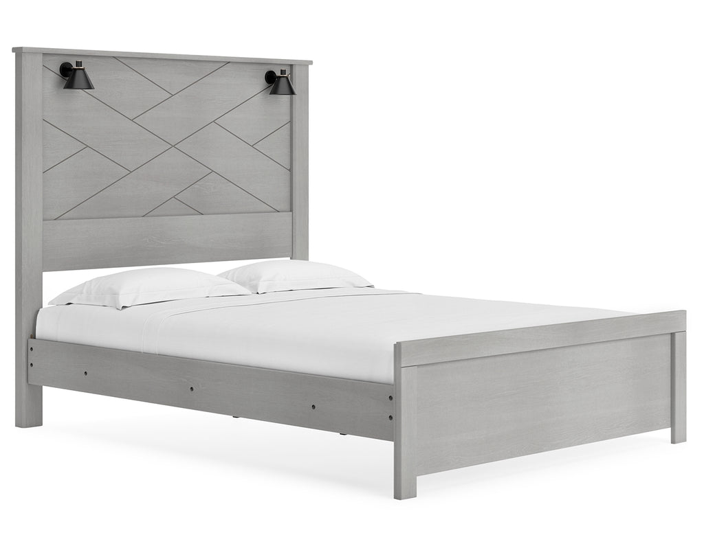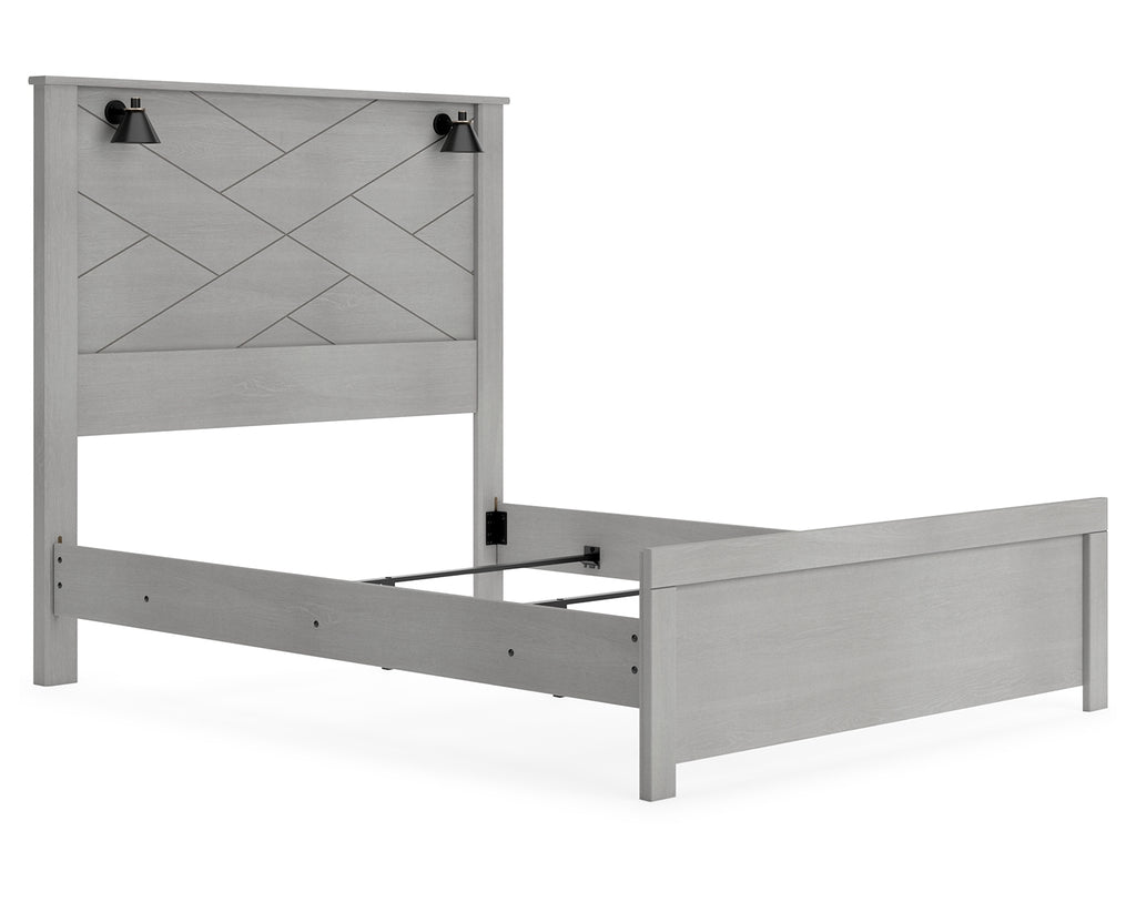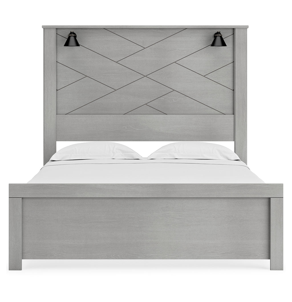 Cool, clean and casually modern. This queen panel bed’s wispy dove gray finish sets the tone for your calming sanctuary. Matte black sconce lights and an abstract design on the headboard bring a fresh look to the bed’s simply stunning profile. | Product Features