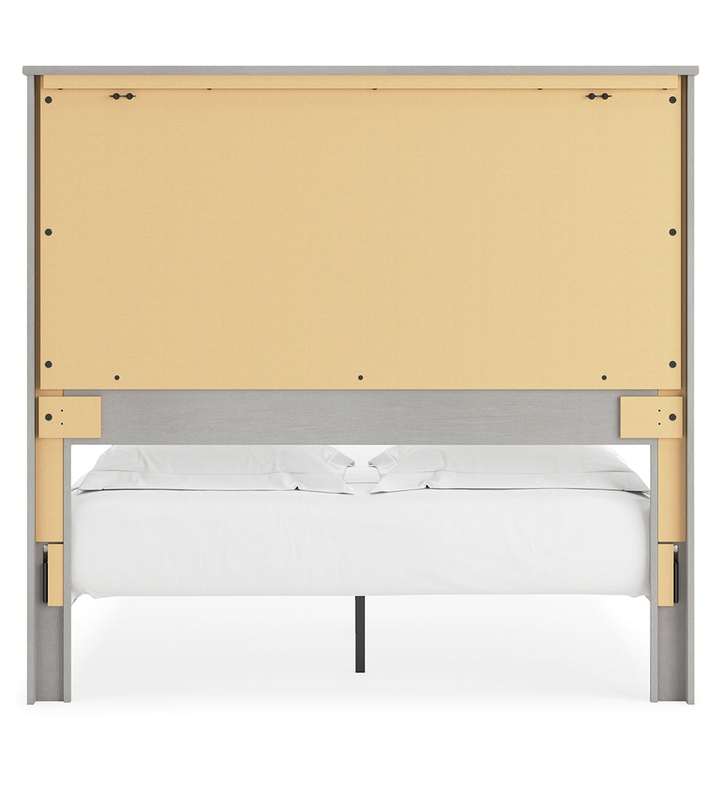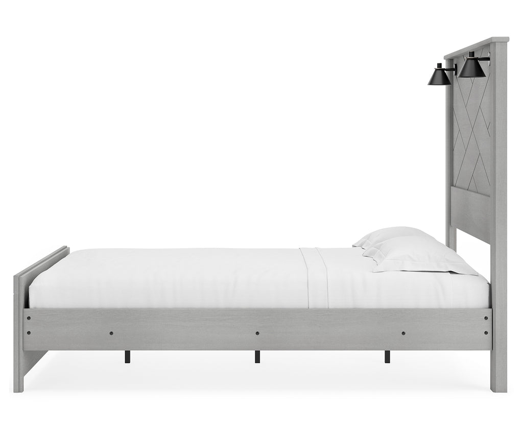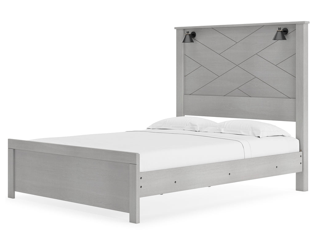 Cool, clean and casually modern. This queen panel bed’s wispy dove gray finish sets the tone for your calming sanctuary. Matte black sconce lights and an abstract design on the headboard bring a fresh look to the bed’s simply stunning profile. | Product Features