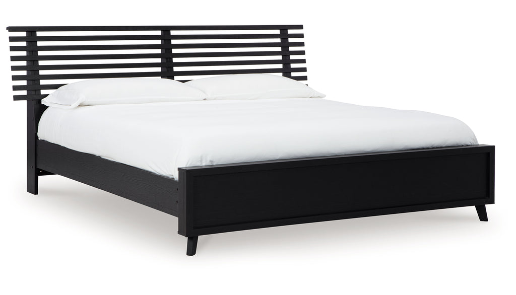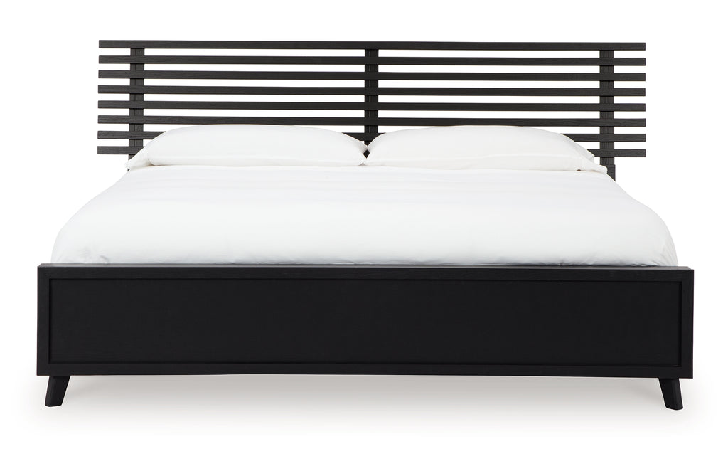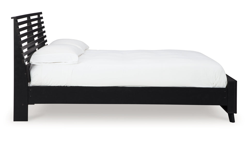 Sophisticated style for the savvy shopper. This panel bed prioritizes affordable, on-trend design. Its subtle replicated texture recalls the natural beauty of wood, highlighting the slatted styling. And a matte black finish savvily suits different approaches to modern aesthetics. Mix and match with light and bright hues, or pair with other dark tones for a moody look. | Product Features