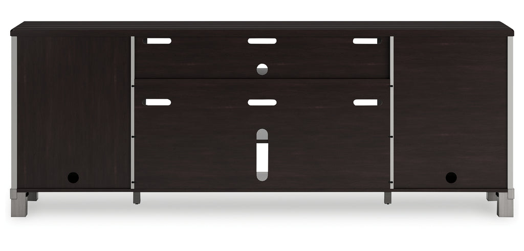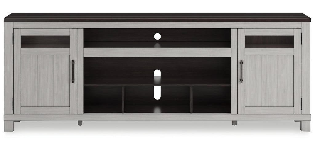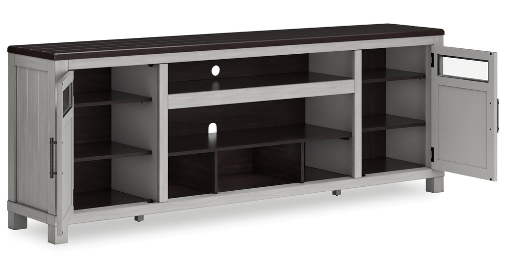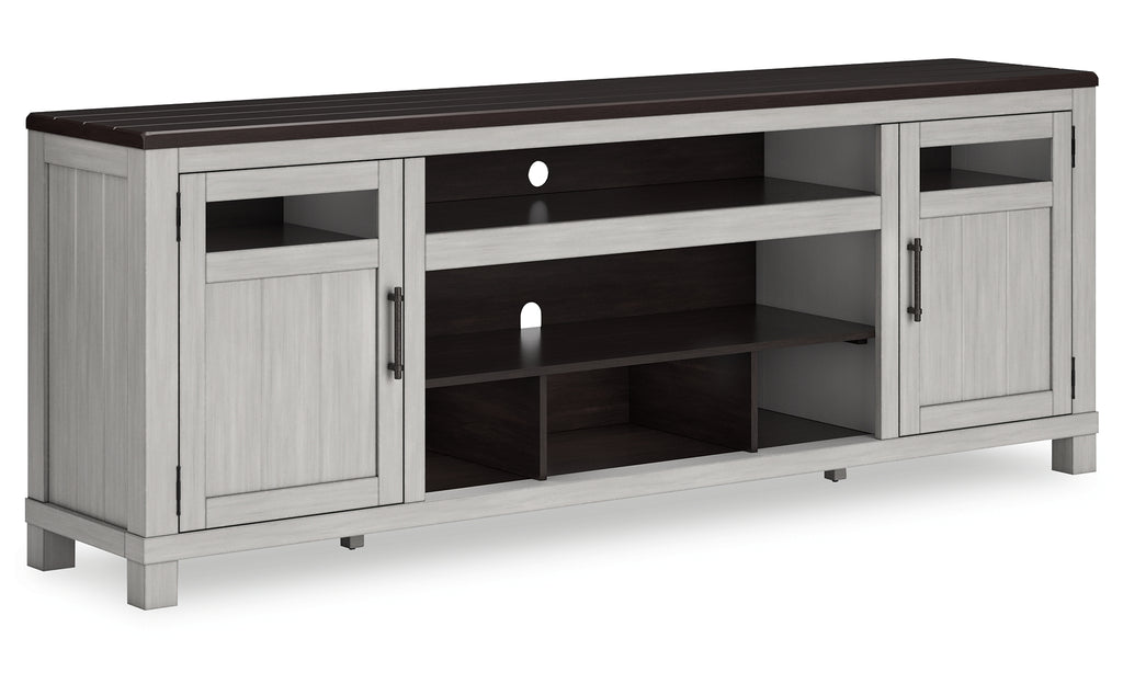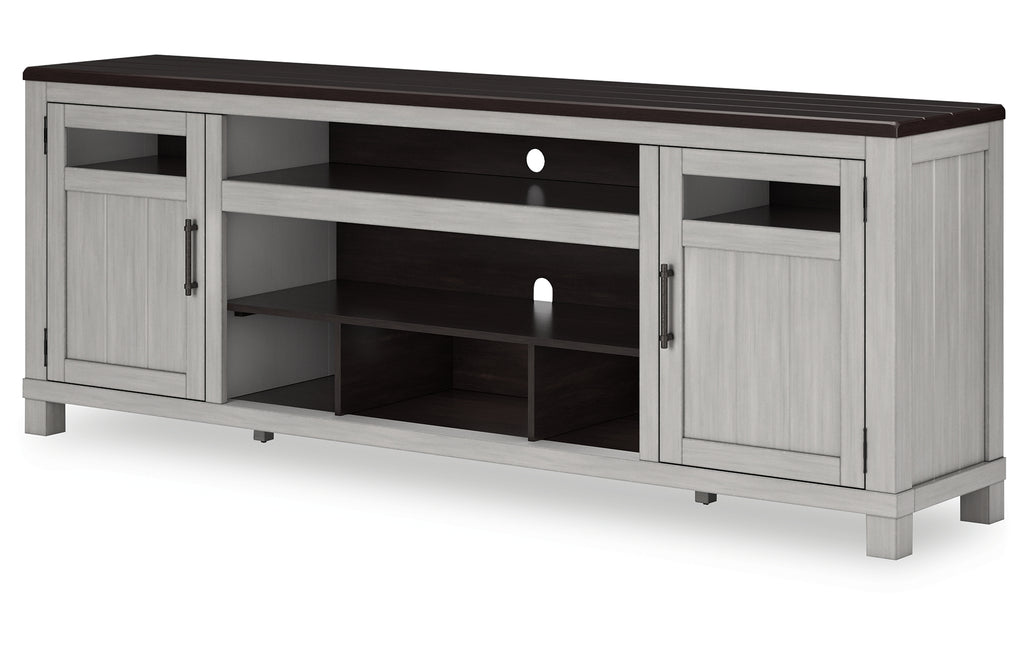 Make a farmhouse-inspired statement with this TV stand. It’s beautifully crafted to stand the test of time, with a planked effect and clean two-tone finish that lend a relaxing vintage feel. With two cabinets (each with an adjustable shelf) and an open cubby, it offers plenty of storage to house all of your electronic needs. Enhancing the experience: the optional fireplace insert (sold separately) brings a touch of warmth and beautiful ambiance to your living room. | Product Features