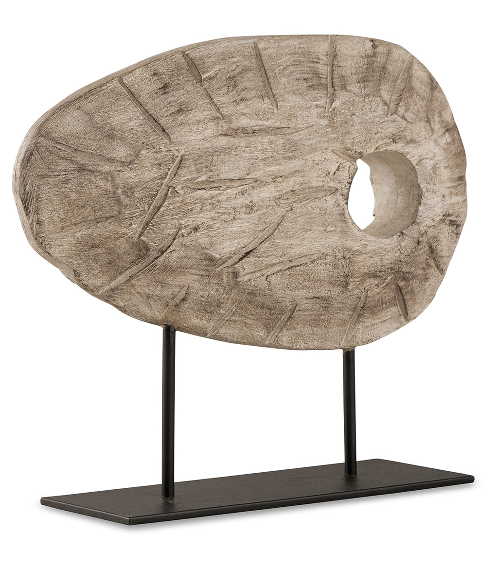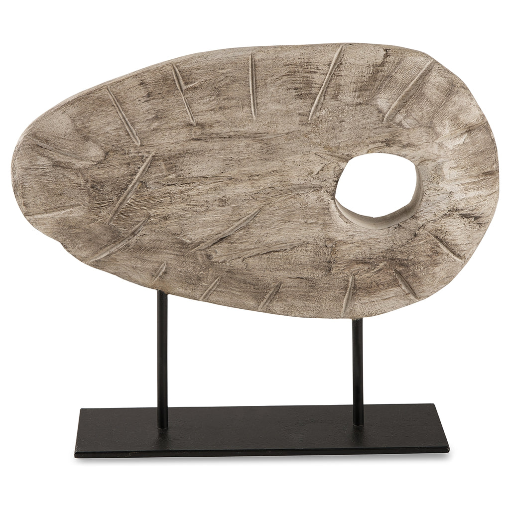 Elegantly adorn your bookshelf, mantel or dining table with this sculpture. Wood in an antiqued white finish is brimming with natural beauty and adds warmth to your space. A sleekly styled black metal base grounds the piece.