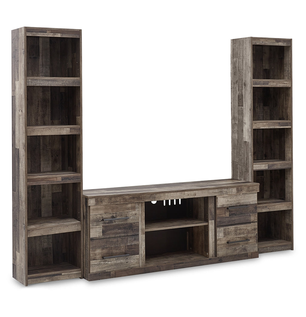 Make this entertainment center the center of attention with its popular urban eclectic style. Its rustic finish over a replicated pine grain creates an authentic natural look for your home entertainment area. You'll love its functionality. Two tall piers with open shelving allow you to put home accents on display, safely out of the way, while the TV stand’s two spacious cabinets with shelved storage easily accommodate media needs.