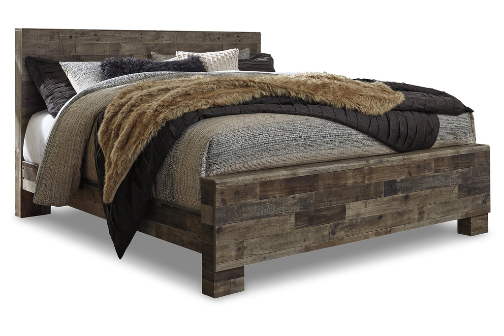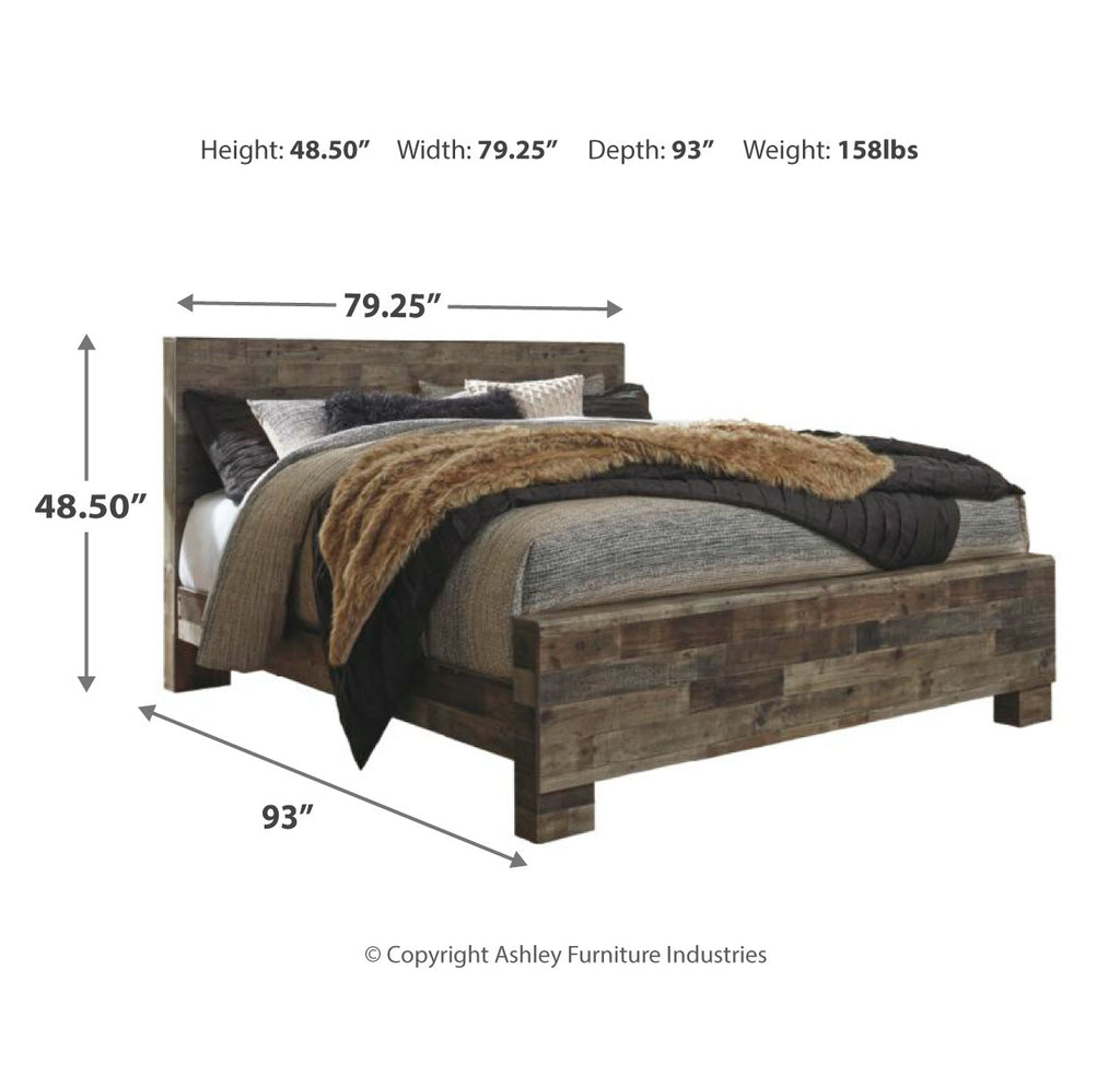 Modern yet hefty. This king panel bed makes an urban eclectic statement. Seasoned raw wood look merges with the clean lined design we love today. Muted rustic finish over replicated pine grain maintains its authenticity for a beauteous look. Mattress and foundation/box spring available, sold separately. | Product Features