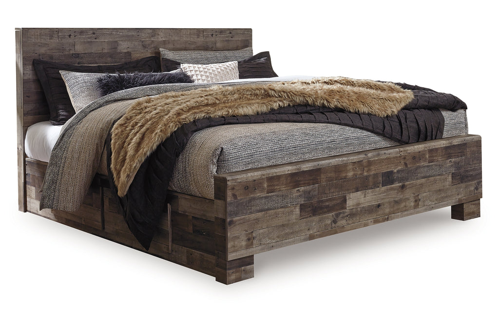 Modern yet hefty. This king panel bed with storage makes an urban eclectic statement. Its seasoned raw wood look merges with the clean-lined design we love today. A muted rustic finish over replicated pine grain maintains its authenticity for a beauteous look. Storage underneath both sides provides ample space for placing belongings out of sight. Mattress available, sold separately. | Product Features