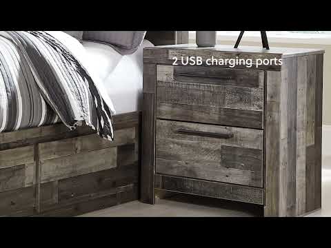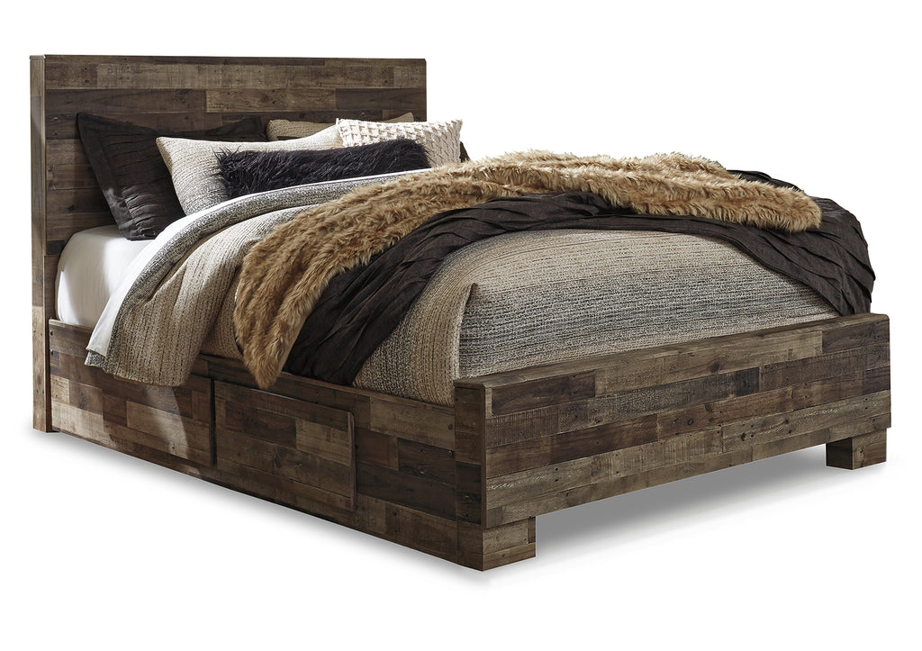 Modern yet hefty. This queen panel bed with storage makes an urban eclectic statement. Seasoned raw wood look merges with the clean lined design we love today. Muted rustic finish over replicated pine grain maintains its authenticity for a beauteous look. Storage in the footboard and underneath the bed provides ample space for placing belongings out of sight. Mattress available, sold separately. | Product Features