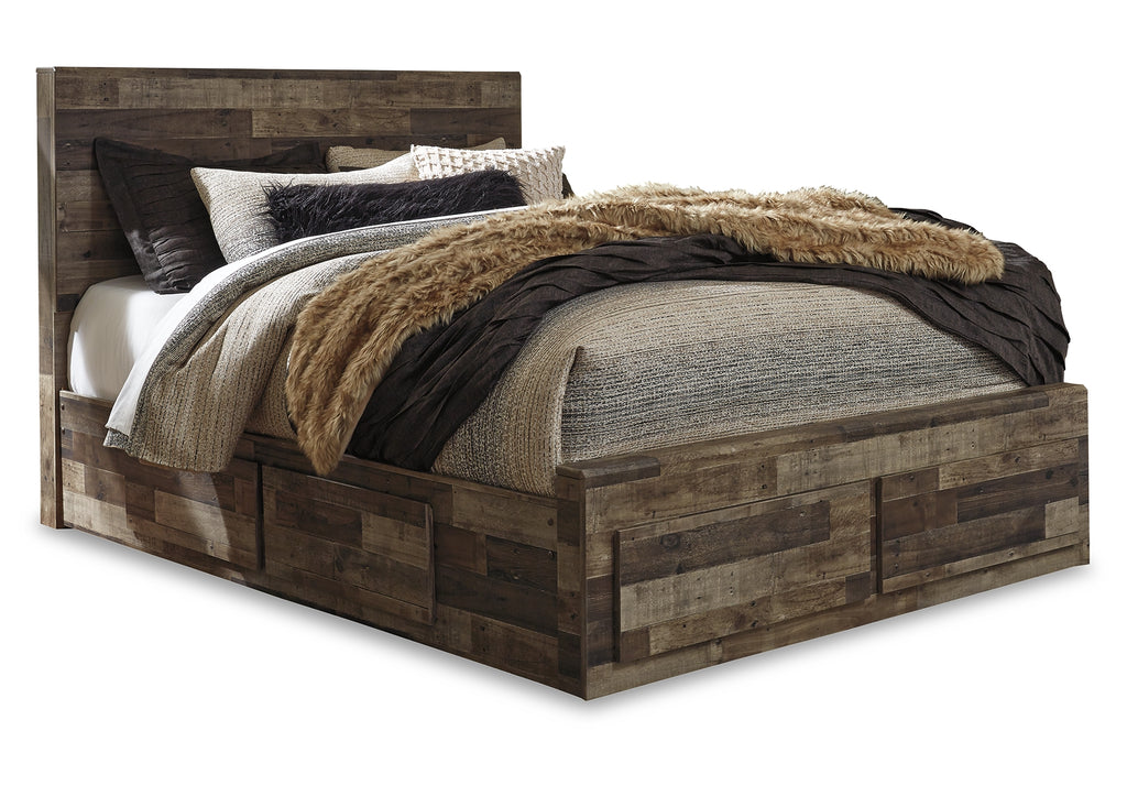 Modern yet hefty. This queen panel bed with storage makes an urban eclectic statement. Seasoned raw wood look merges with the clean lined design we love today. Muted rustic finish over replicated pine grain maintains its authenticity for a beauteous look. Storage in the footboard and underneath the bed provides ample space for placing belongings out of sight. Mattress available, sold separately. | Product Features