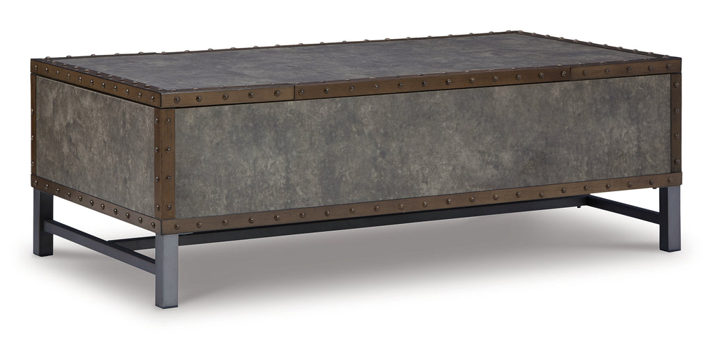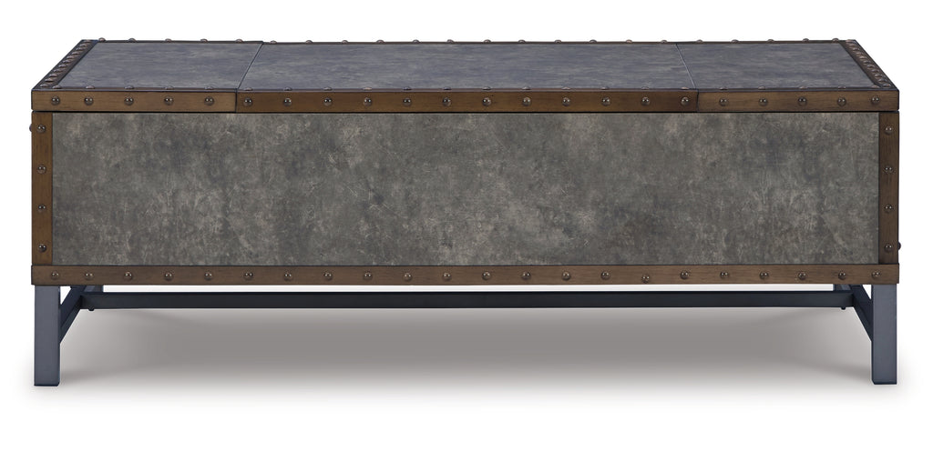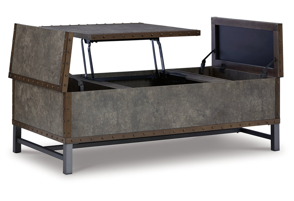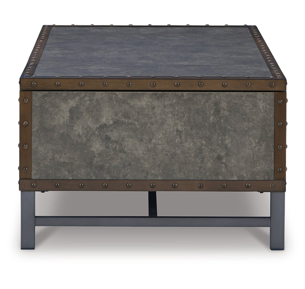Reinvented for the here and now, this lift-top coffee table rocks vintage industrial design with a traditional vibe. Its metal accent trim and bronze-tone metal base frame are ready to embrace the modern demands of everyday life. Two spacious storage bins provide additional storage, while the center lift top transforms into a casual work center or extra dining space when needed. | Product Features