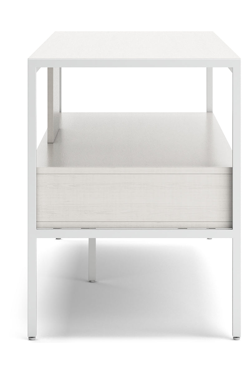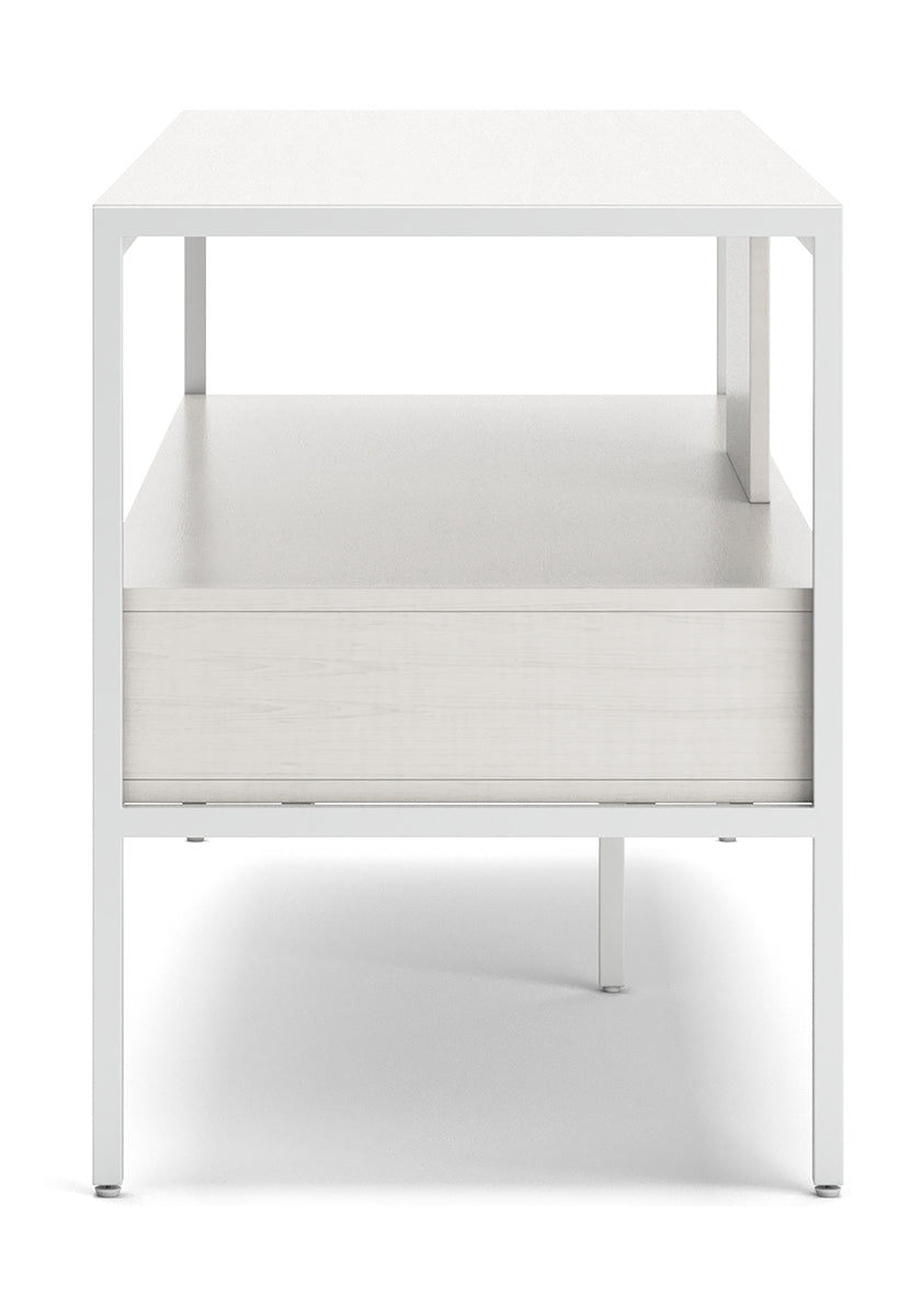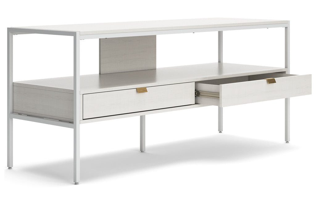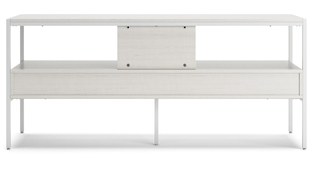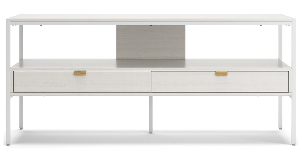 Bring your vision of a modern living room to life with this sleekly designed TV stand. Its linear construction and white finish keep things minimal. An open shelf and two drawers allow you to store in simply streamlined style, rounding out this versatile, striking piece. | Product Features