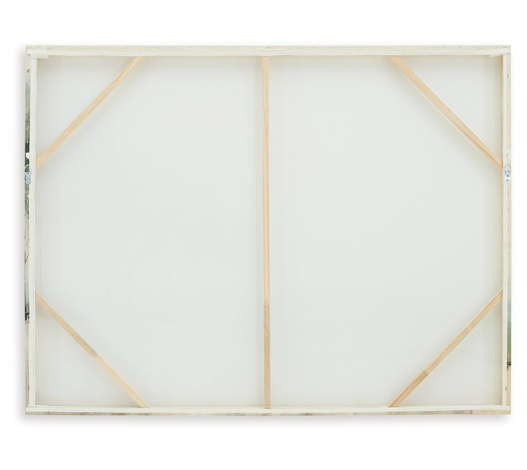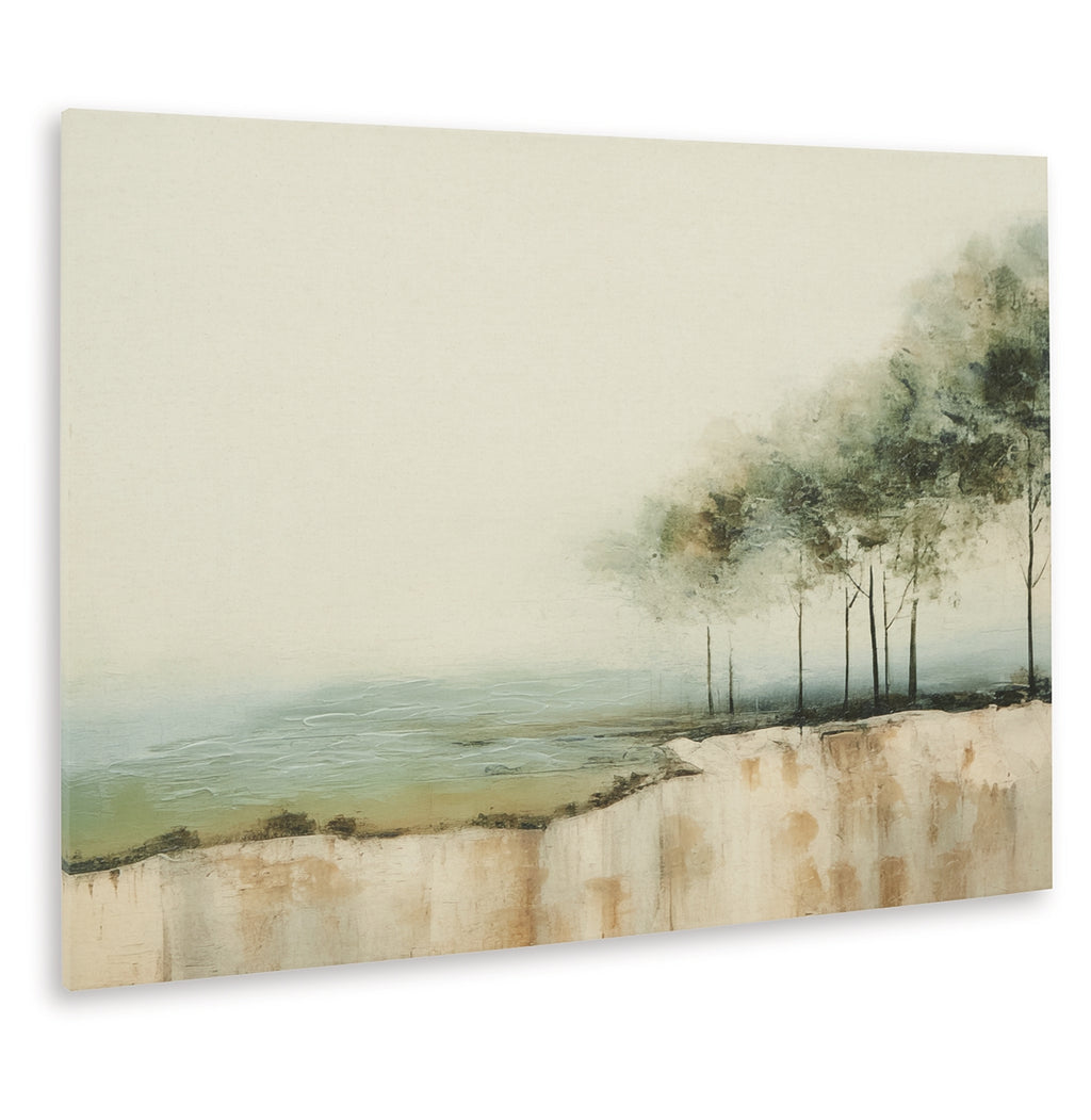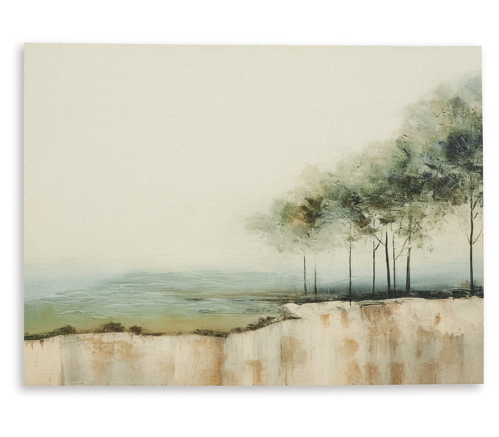 Take in the tranquil ambiance of this wall art. A muted background, in calming shades of beige, green, black and blue, gives the impression of fog rolling in. Beautifully finished with hand-painted embellishments, this peaceful landscape gives your decor a simply serene upgrade. | Product Features