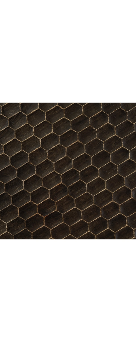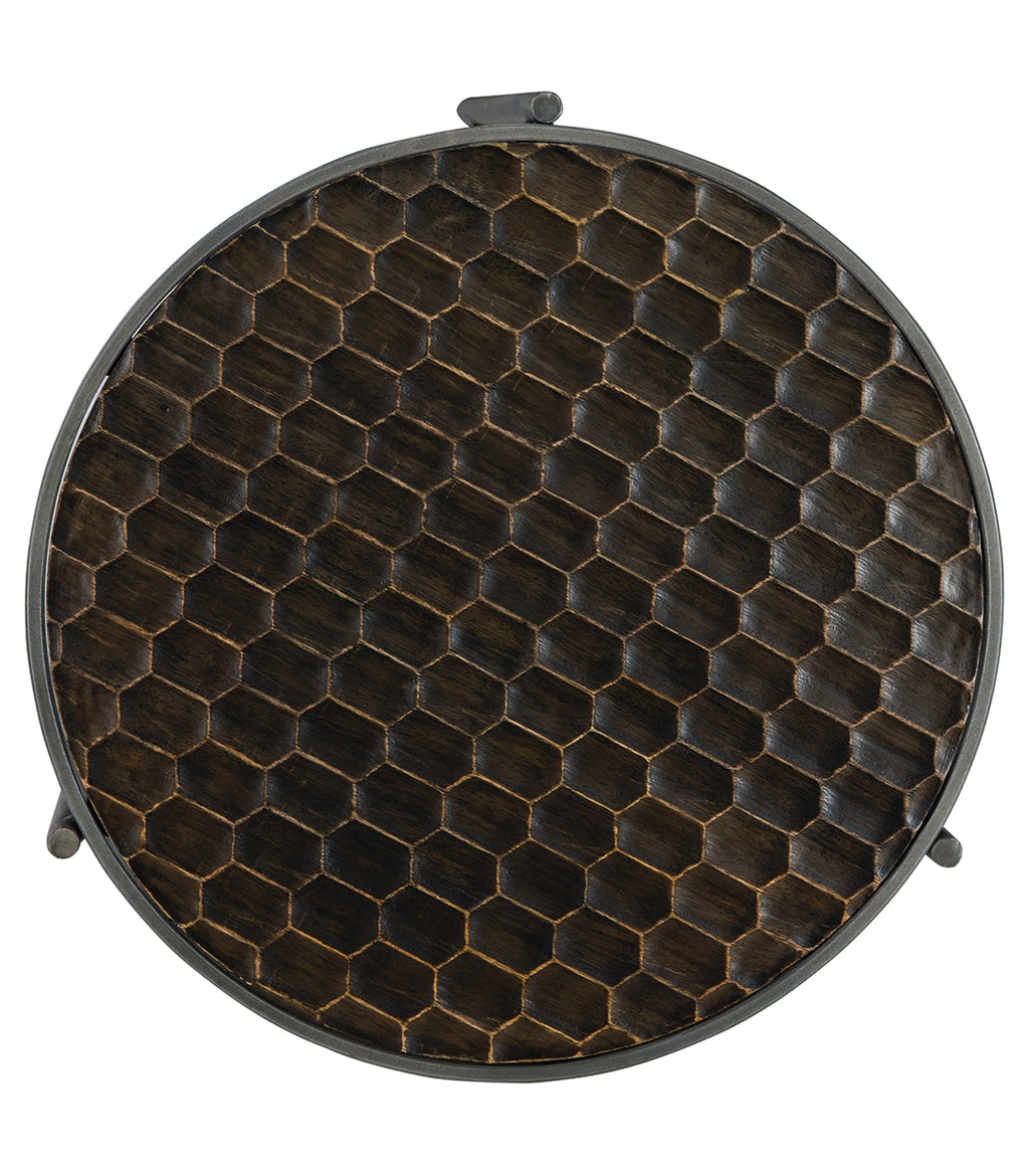 Play up your contemporary cool character with this chairside end table. The scooped honeycomb design on the top recalls retro motifs for a modern era, with a distressed brown finish enhancing the pattern. A round tubular base with a gray glaze rounds out the look. This table glows with a refined kind of radiance. |