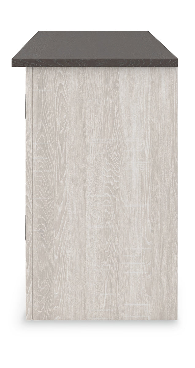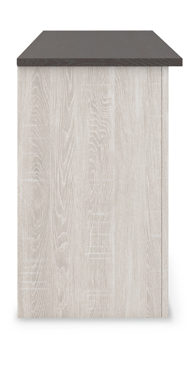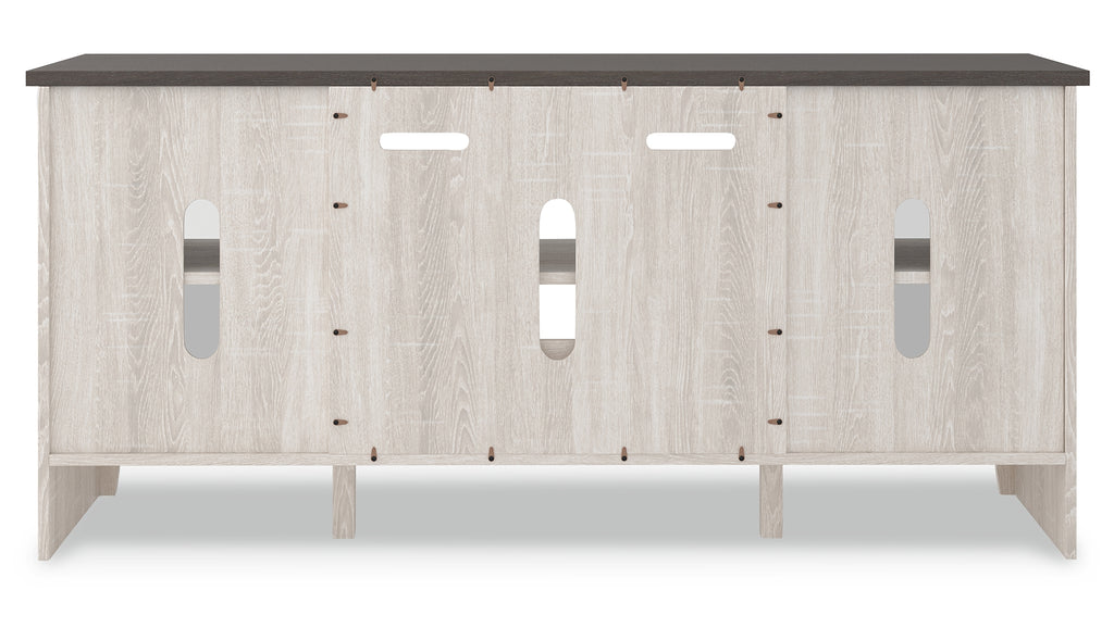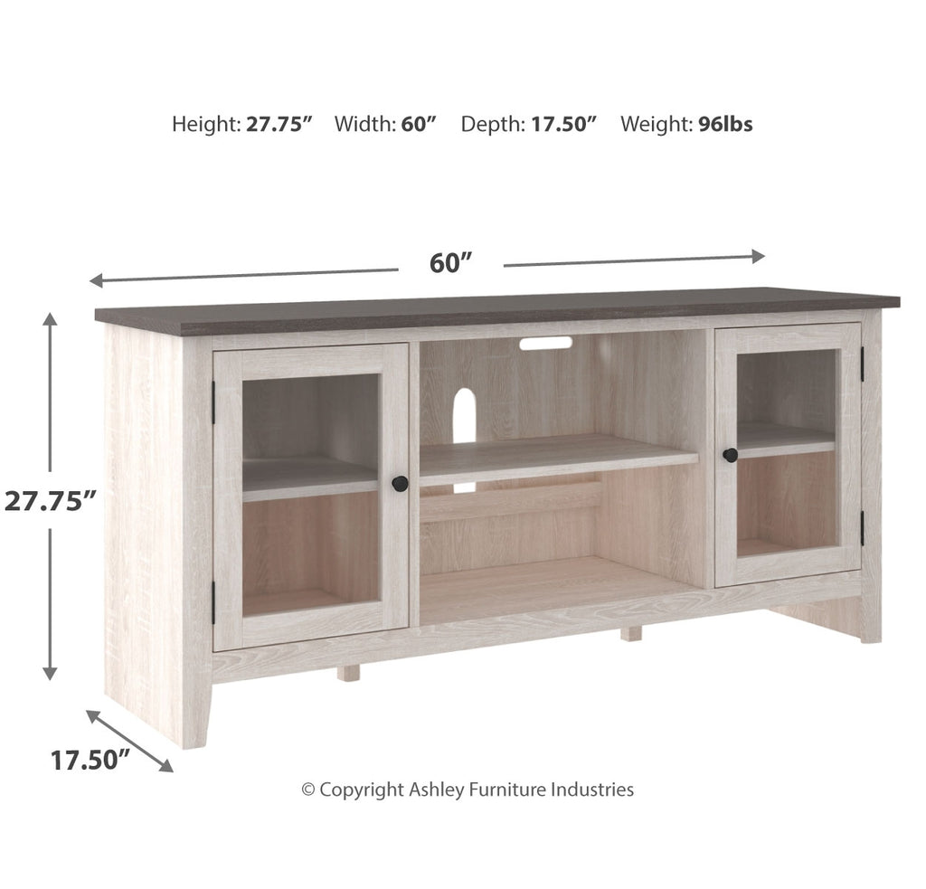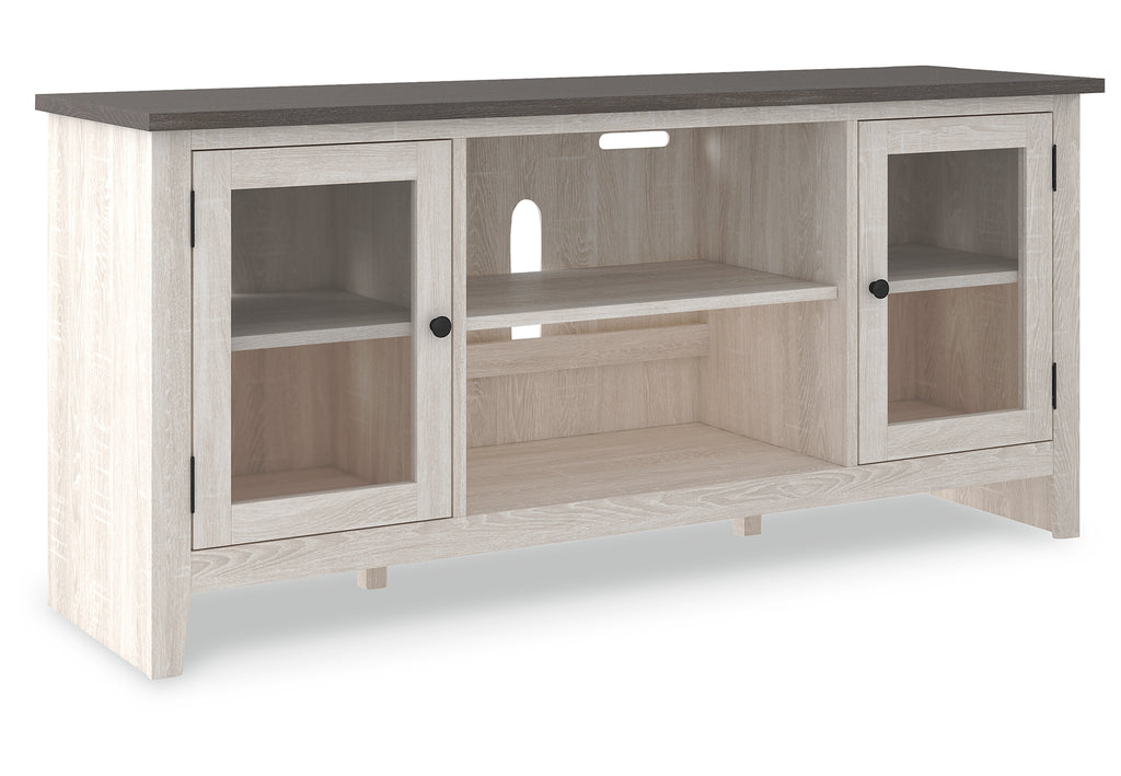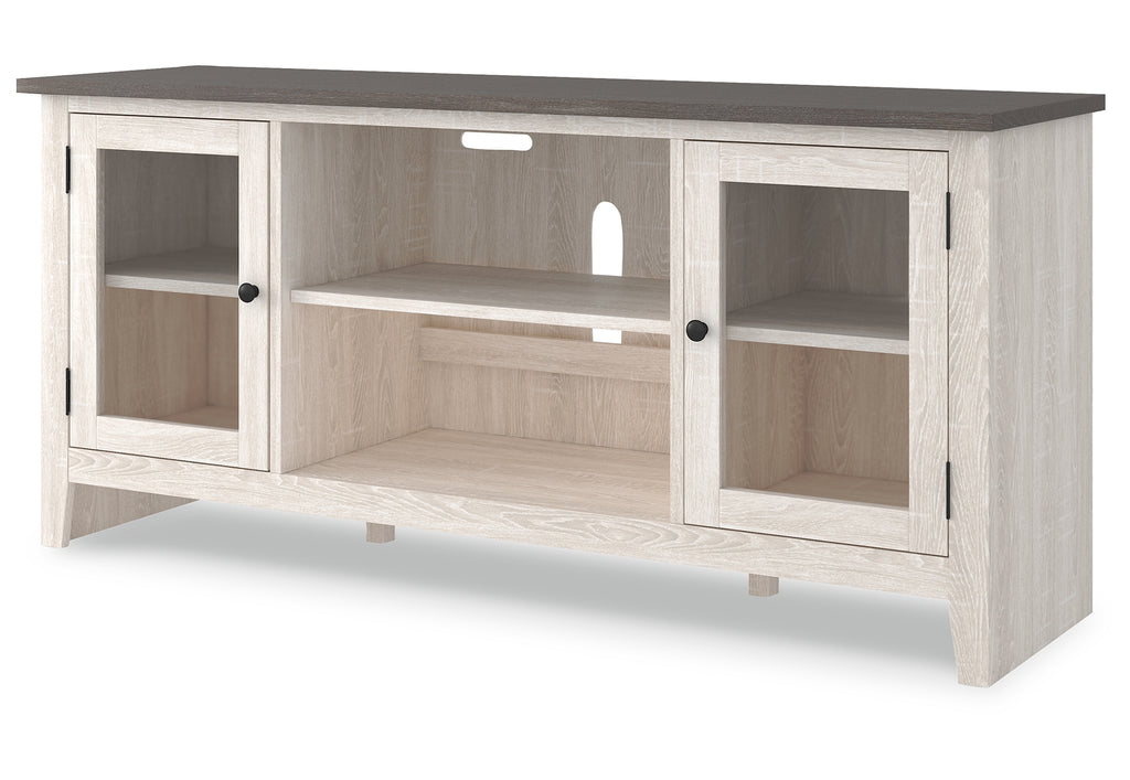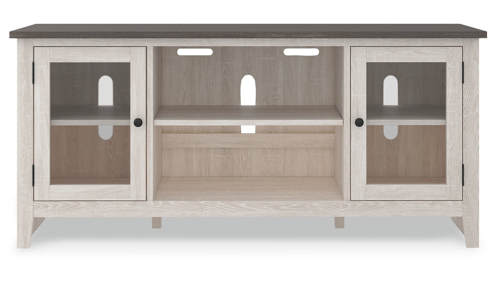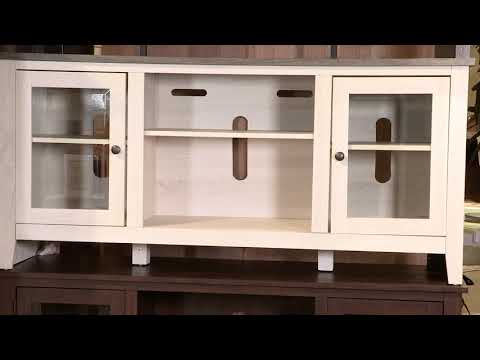 With its two-tone finish and minimalist charm, this TV stand with fireplace option is right in tune with your relaxed approach to high style. Beautifully made to accommodate your media equipment, it’s well equipped with adjustable shelving, cutouts for wire management and a pair of glass-front doors that enhance the clean-lined aesthetic. The look is ideal for modern farmhouse and contemporary settings. | Product Features