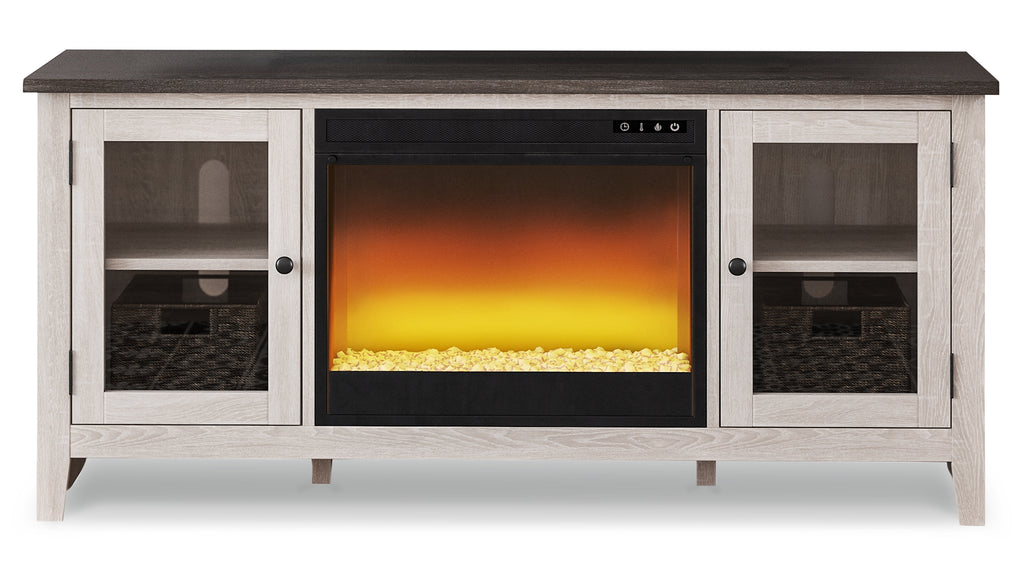 With its two-tone finish and minimalist charm, this TV stand with electric fireplace insert is right in tune with your relaxed approach to high style. Beautifully made to accommodate your media equipment, it’s well equipped with adjustable shelving, cutouts for wire management and a pair of glass-front doors that enhance the clean-lined aesthetic. The look is ideal for modern farmhouse and contemporary settings. Adding that much more show-stopping style, the electric fireplace insert operates with or without heat and includes a six-level temperature setting, a remote control and an overheating control for added safety. It comes with faux glass crystals and natural stones, so you can customize the look of the flame bed. | Product Features