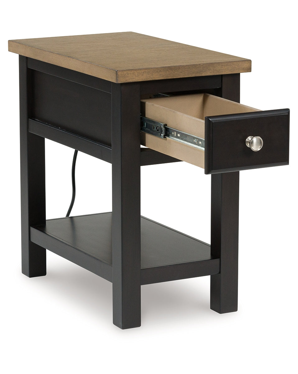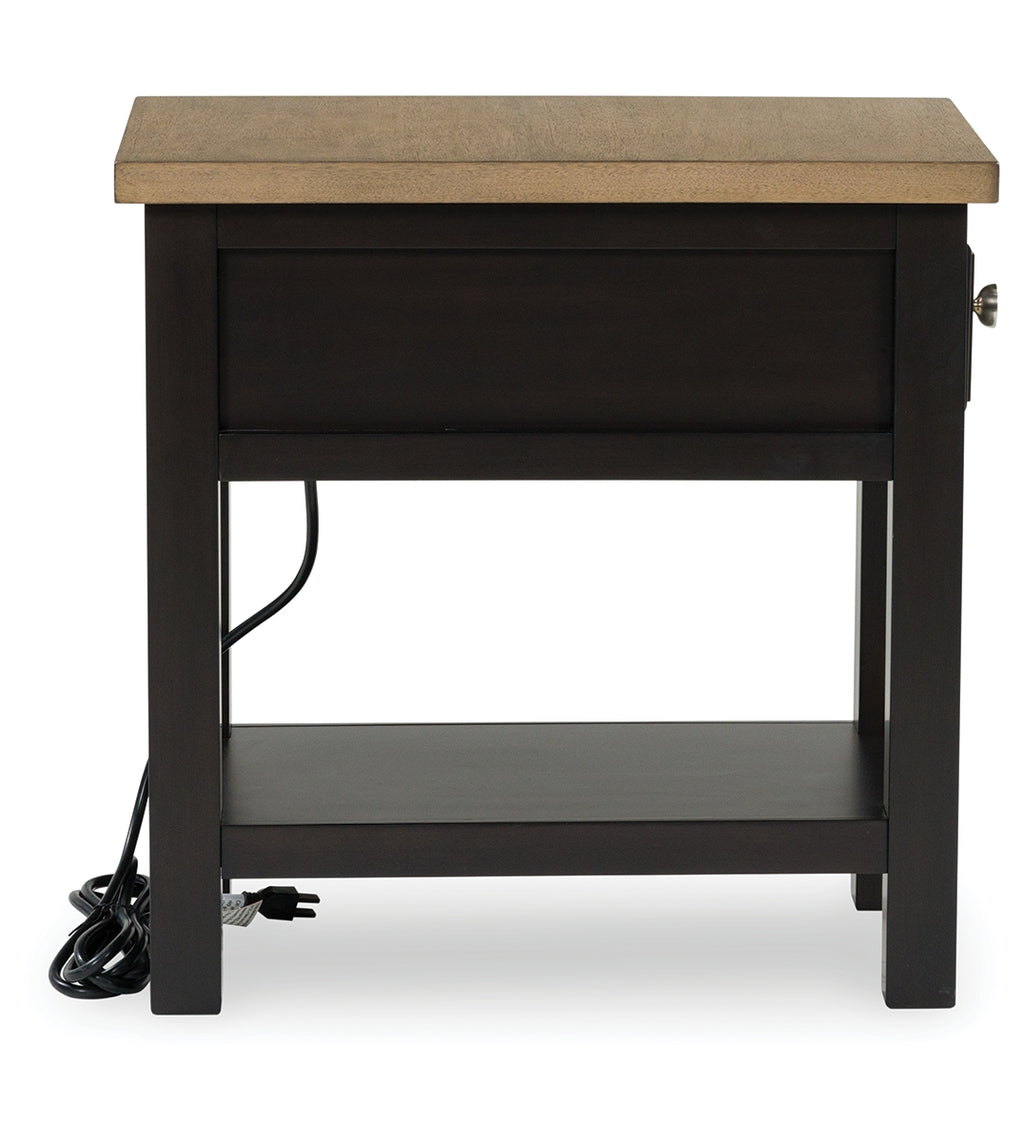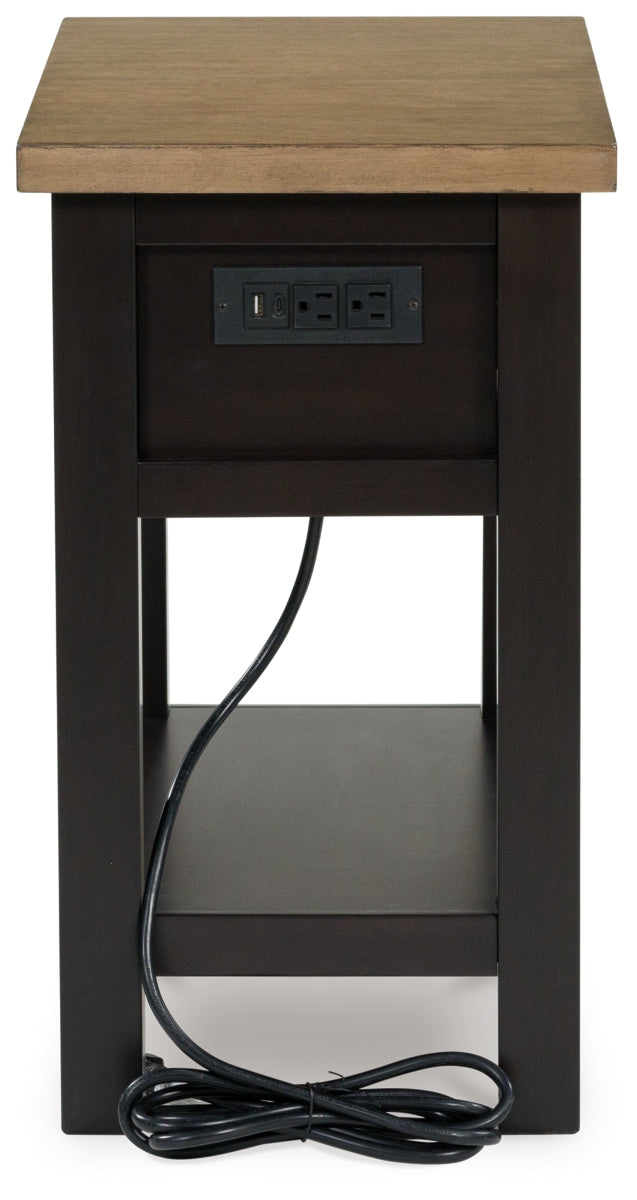 When you’re styling your living room, convenience is key. With this chairside end table, casual flair meets can’t-miss function. Tired of trekking to find a charger when your device is dead? This table's built-in outlets and USB ports allow you to stay at ease in your favorite seat. The fashionably functional piece pairs a dark chocolate brown with a light wood tone, complementing a variety of color palettes. | Product Features