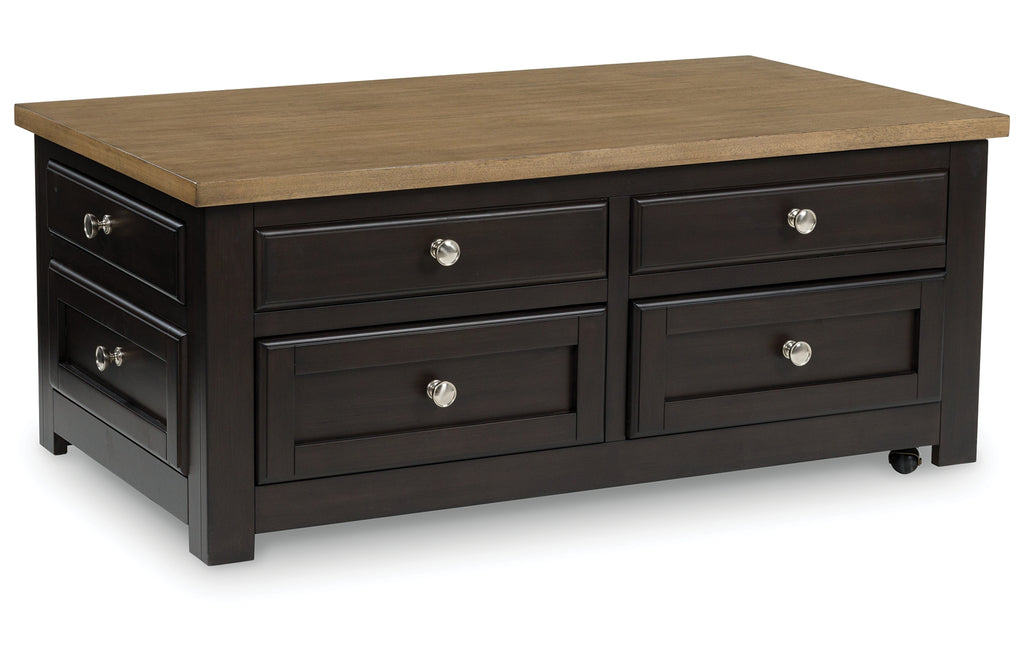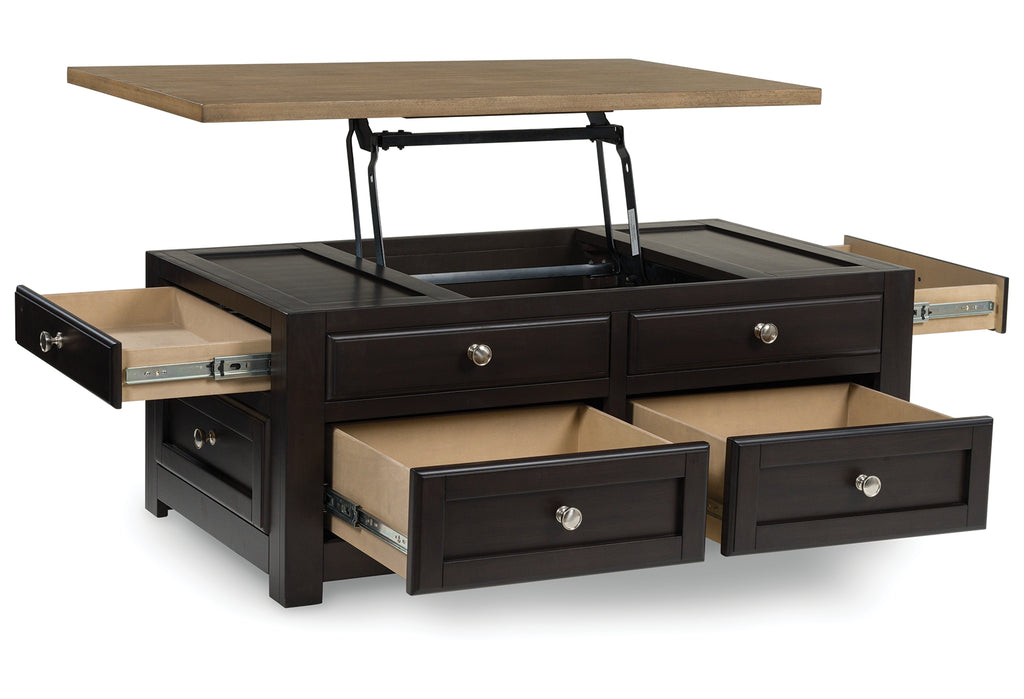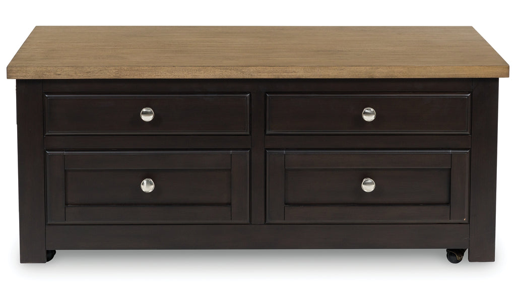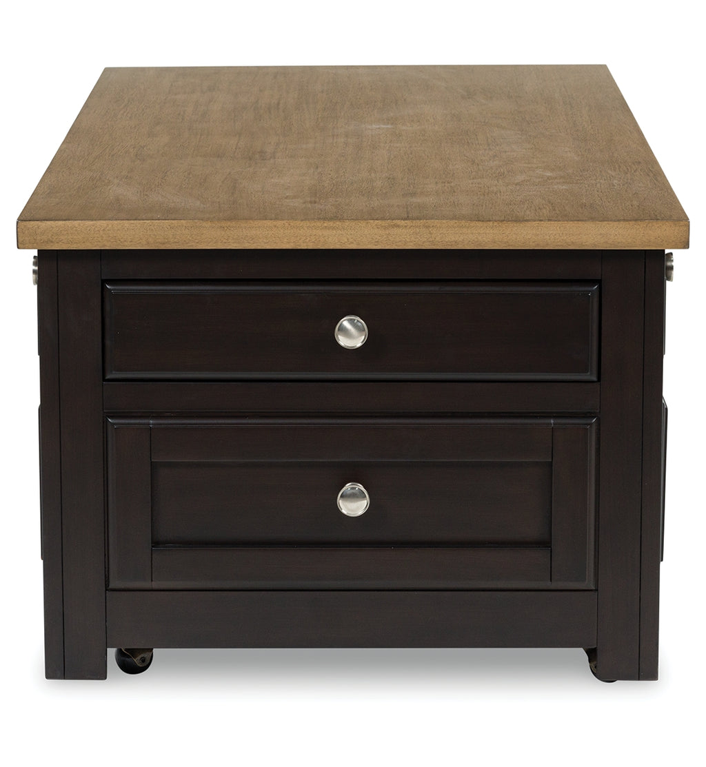 When you’re styling your living room, convenience is key. With this lift-top coffee table, casual flair meets can’t-miss function. The hidden lift top brings added comfort to work-from-home tasks or chilling out by the TV for dinner. When you need to rearrange, built-in casters allow you to wheel the coffee table away with ease. This fashionably functional piece pairs a dark chocolate brown with a light wood tone, complementing a variety of color palettes. | Product Features