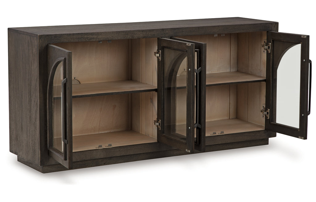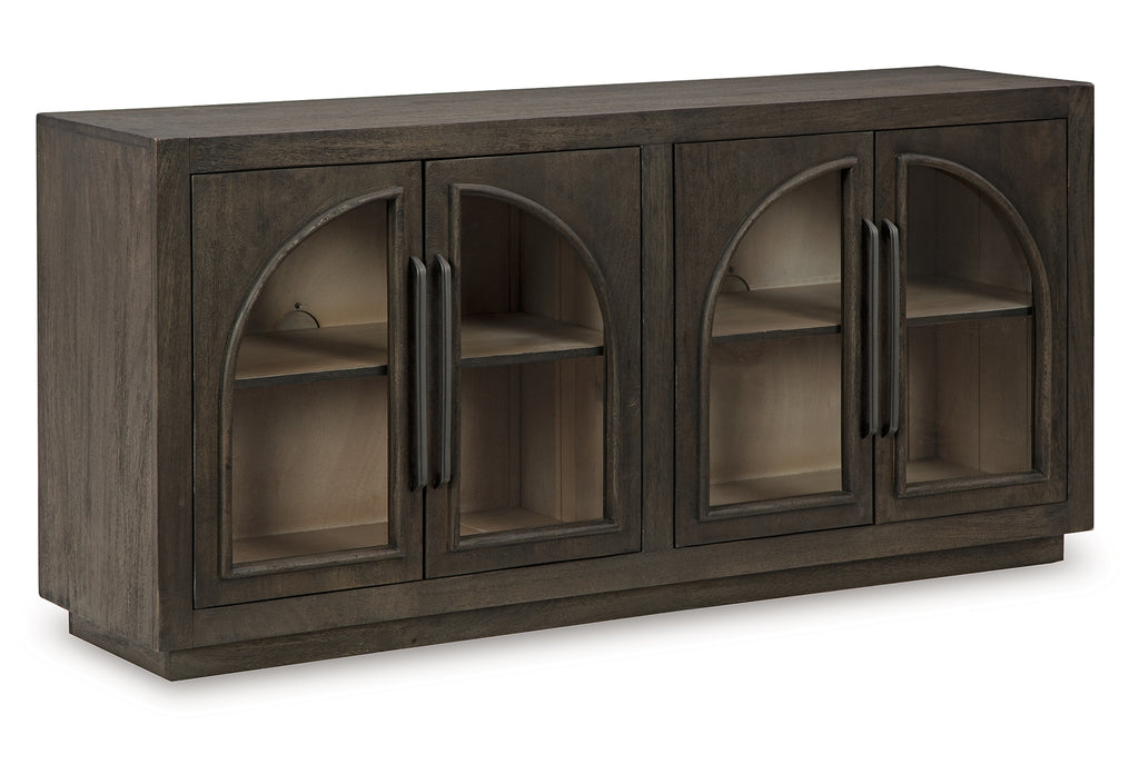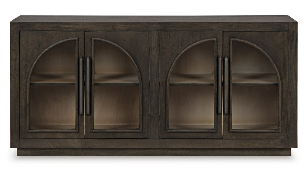 Bring a timeless look to your home or office with this accent cabinet. Traditional lines and a distinctive two-tone finish lend seriously classic vibes to this piece. Arched glass door fronts and two shelves make it easy to display and store in stunning style. | Product Features
