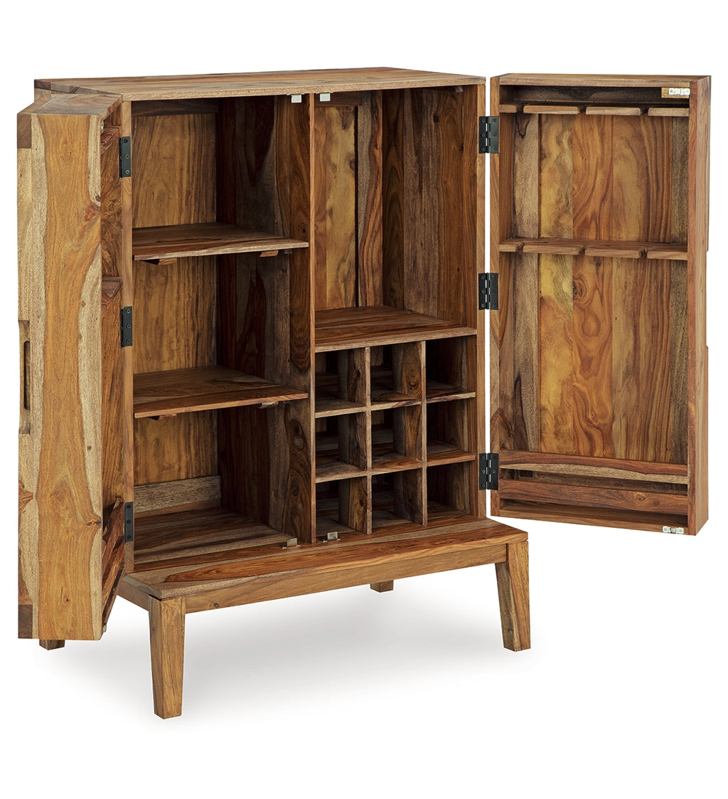 Discover something extraordinary with this clean-lined bar cabinet. The rich natural beauty of the wood, enhanced with a clear wood-tone finish, brings an organically stunning vibe to your home. Strikingly simple, this piece makes entertaining easy with plenty of storage space for your favorite wine bottles, stemware and bar accessories. | Product Features
