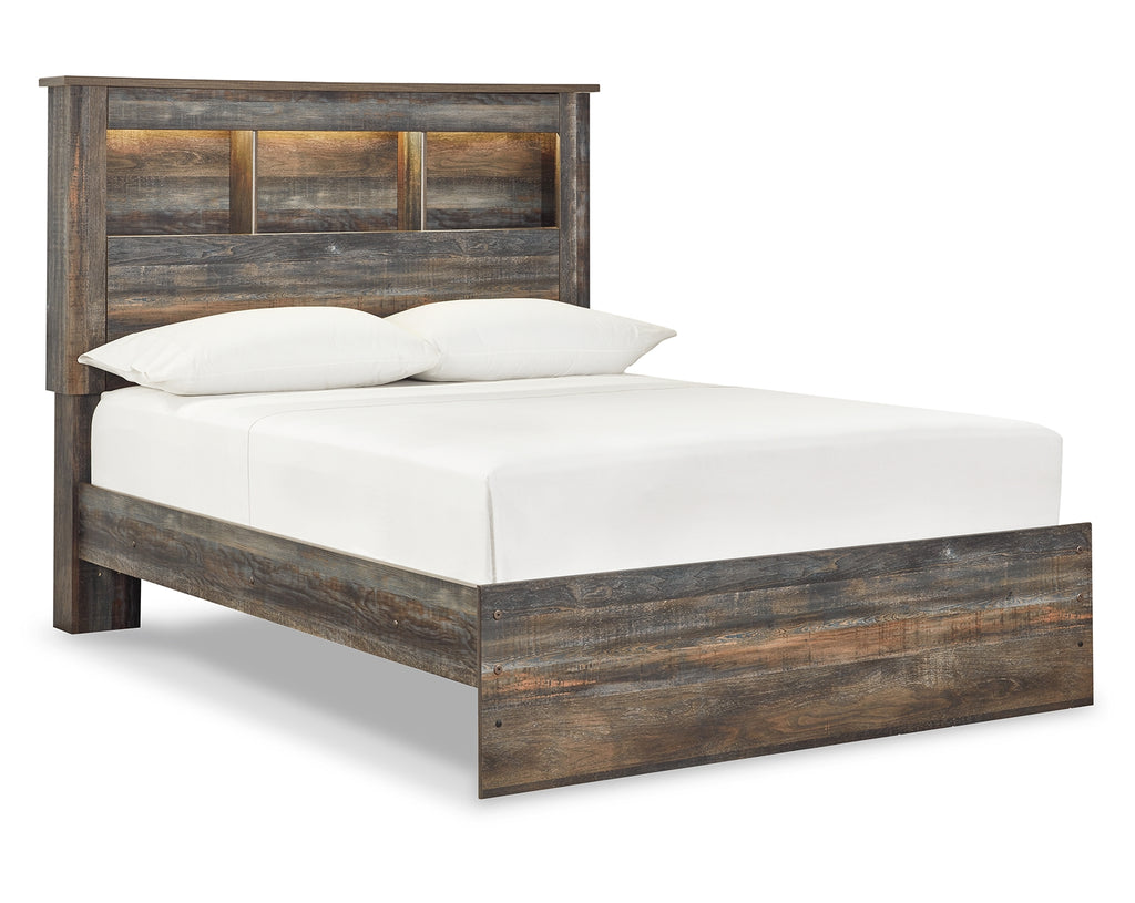 When merged in just the right way, rustic and industrial styles can make one happy marriage. Case in point: this full bookcase bed. A refined take on barn board beauty, its complex, replicated wood grain showcases hints of burnt orange and teal tones for a sense of weatherworn authenticity. Three open cubbies lined with a dimming LED light strip keep bedtime reads top of mind. | Product Features
