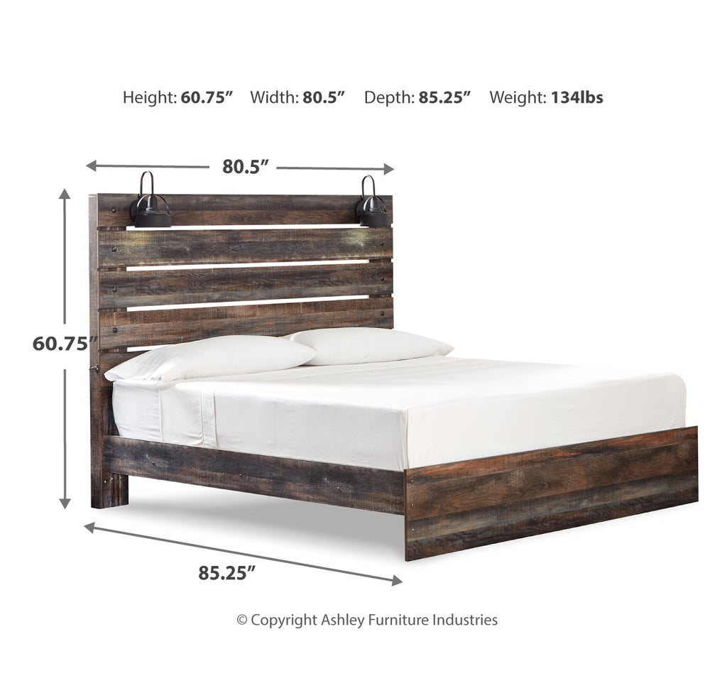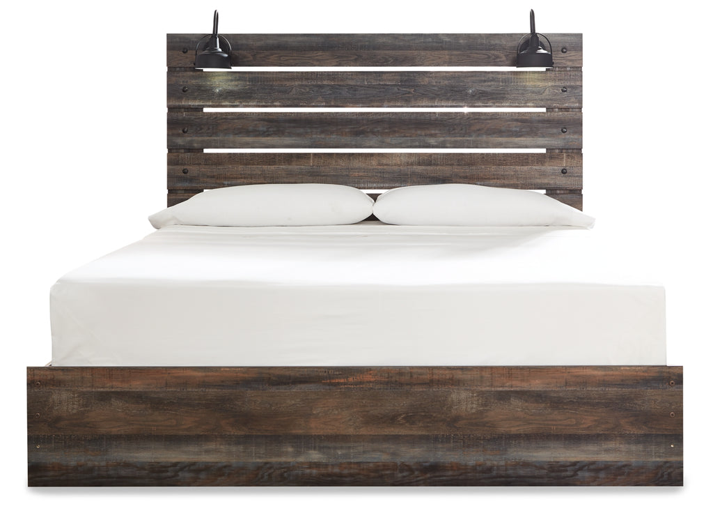 When merged in just the right way, rustic and industrial styles can make one happy marriage. Case in point: this king panel bed. A refined take on barn board beauty, its complex, replicated wood grain showcases hints of burnt orange and teal tones for a sense of weatherworn authenticity. Love to read in bed? You're sure to find the pair of retro-chic light sconces and USB plug-ins on the open-slat style headboard such a bright idea. Mattress and foundation/box spring available, sold separately. | Product Features