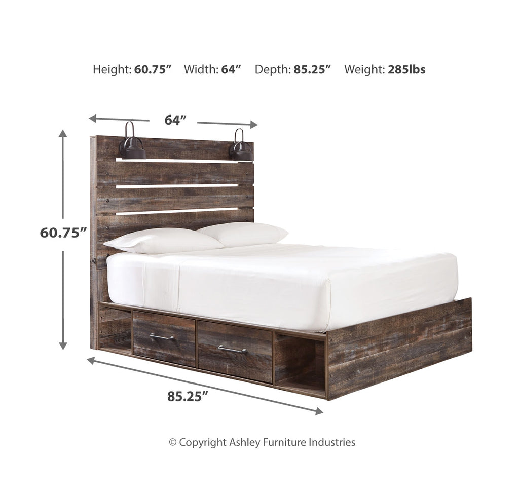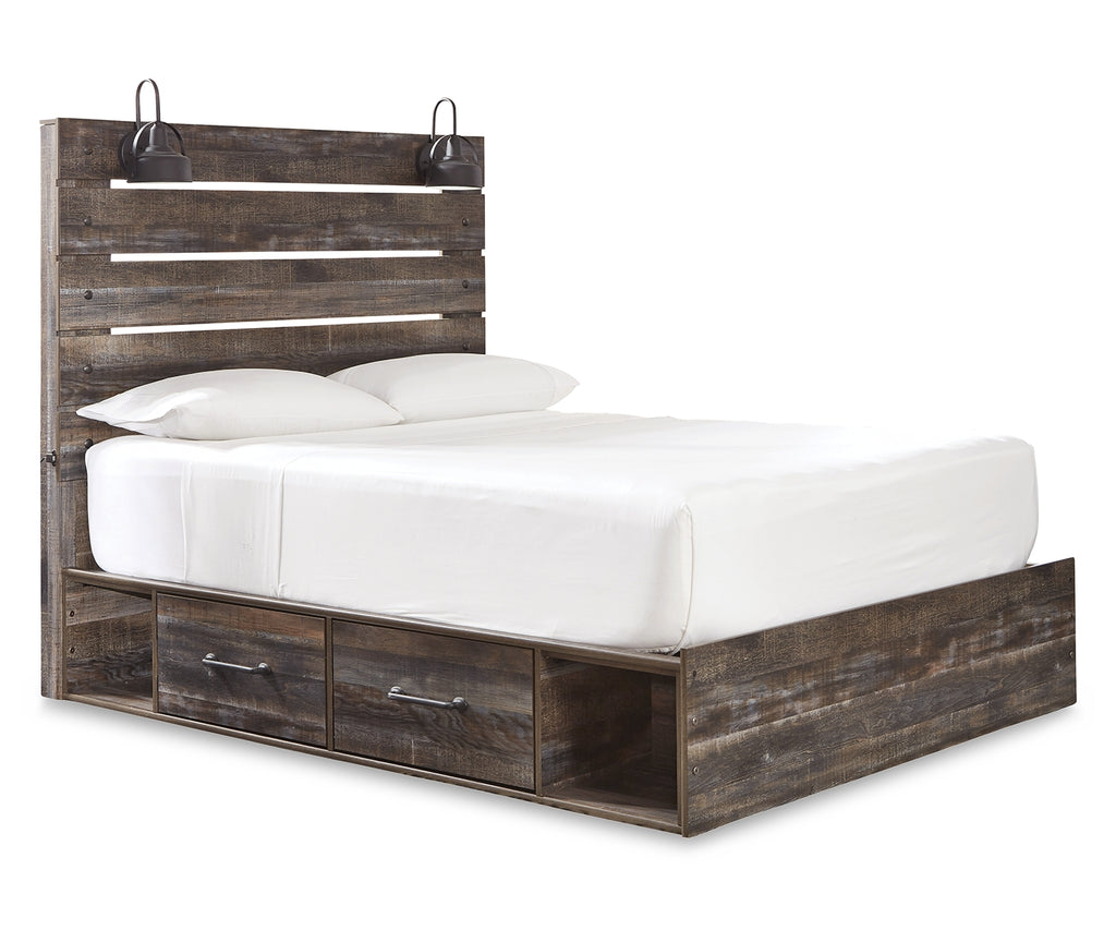 When merged in just the right way, rustic and industrial styles can make one happy marriage. Case in point: this queen panel bed with storage. A refined take on barn board beauty, its complex, replicated wood grain showcases hints of burnt orange and teal tones for a sense of weatherworn authenticity. Love to read in bed? You’re sure to find the pair of retro-chic light sconces and USB plug-ins on the open-slat style headboard such a bright idea. Underneath the bed: four smooth-gliding drawers and four open cubbies that accommodate casually cool storage bins. | Product Features
