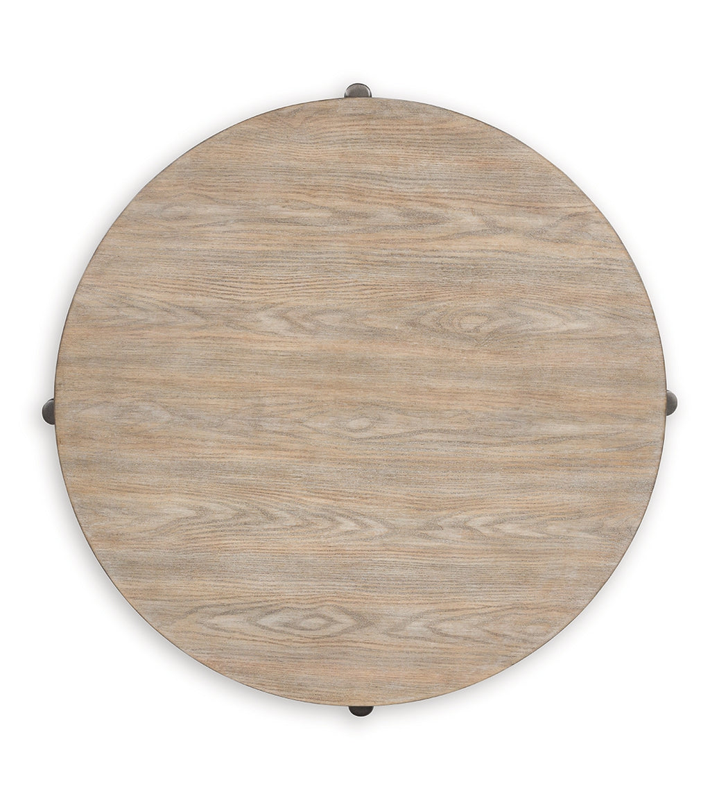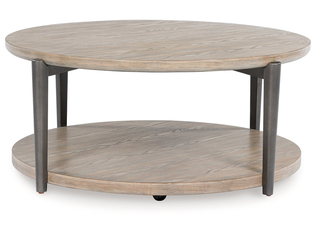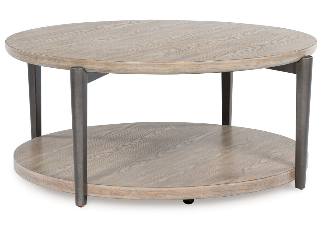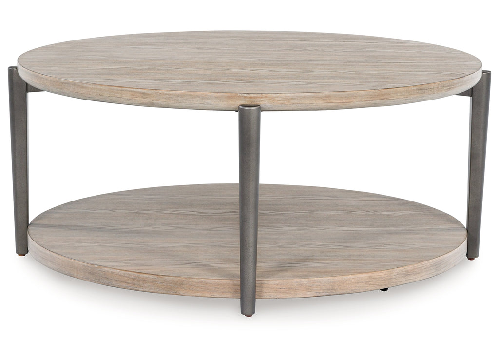 Merging industrial and contemporary elements, this coffee table turns display space into an art form. The whitish brown wood-tone finish is right on trend, while contrasting painted metallic legs offer a modern touch of stripped-back beauty. With its streamlined design, this table proves that less is more.