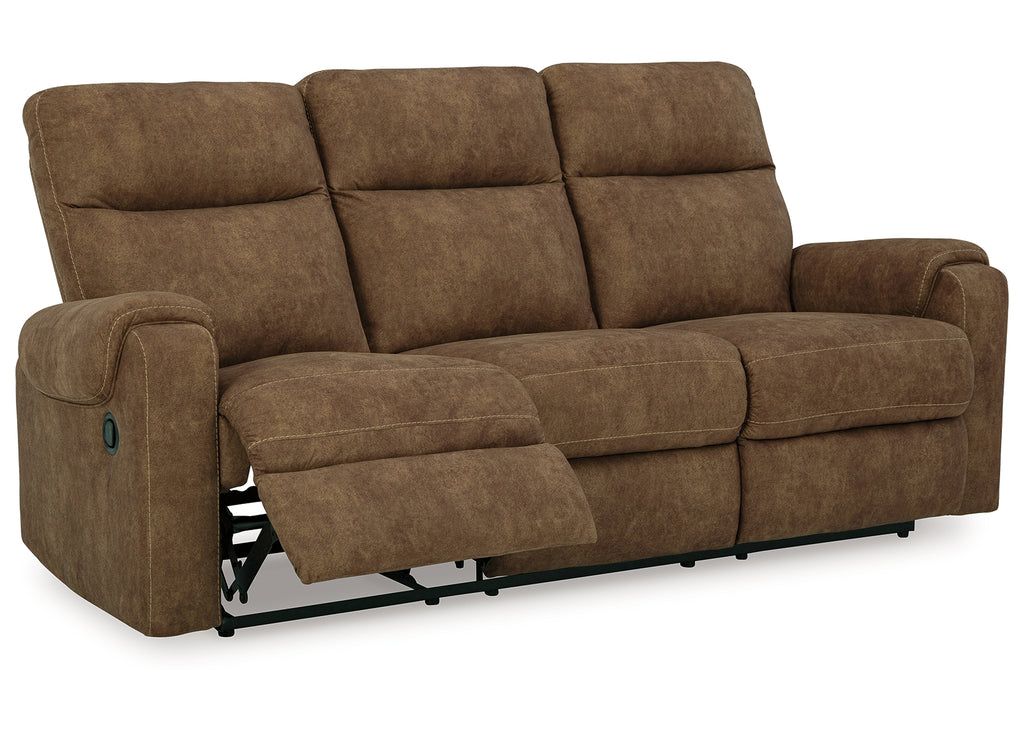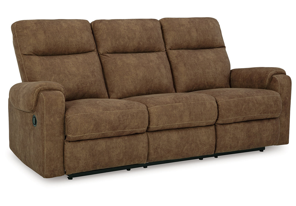 This reclining sofa is your best shot for comfort and total relaxation. Its super soft faux leather, contemporary bustle back and contrast stitching team up for a big win with most any color scheme and room decor. With the pull tab reclining motion, you're on your way to endless relaxation at home solo or when hosting friends. | Product Features |