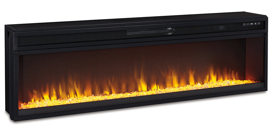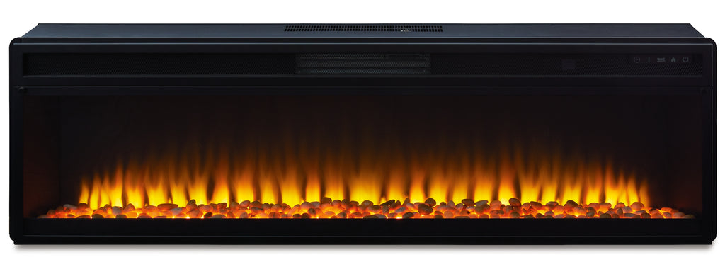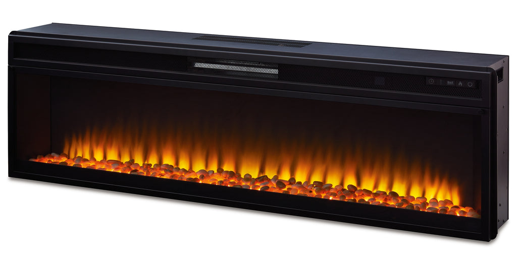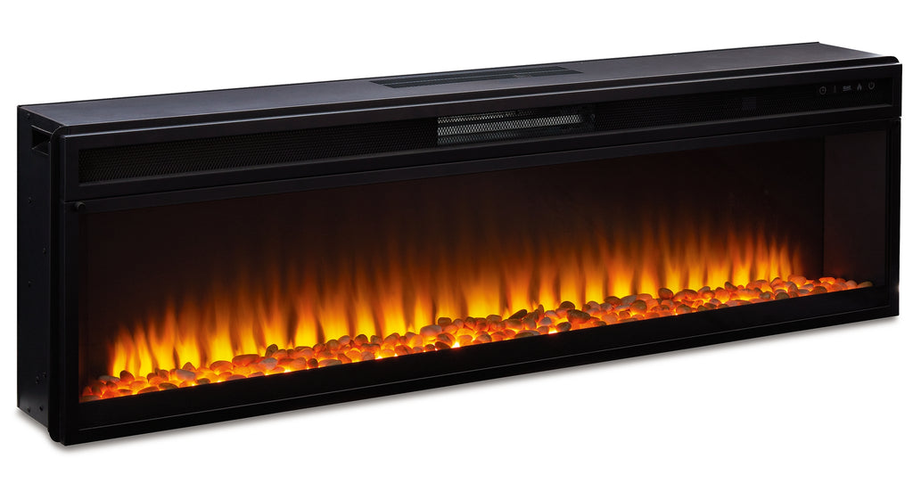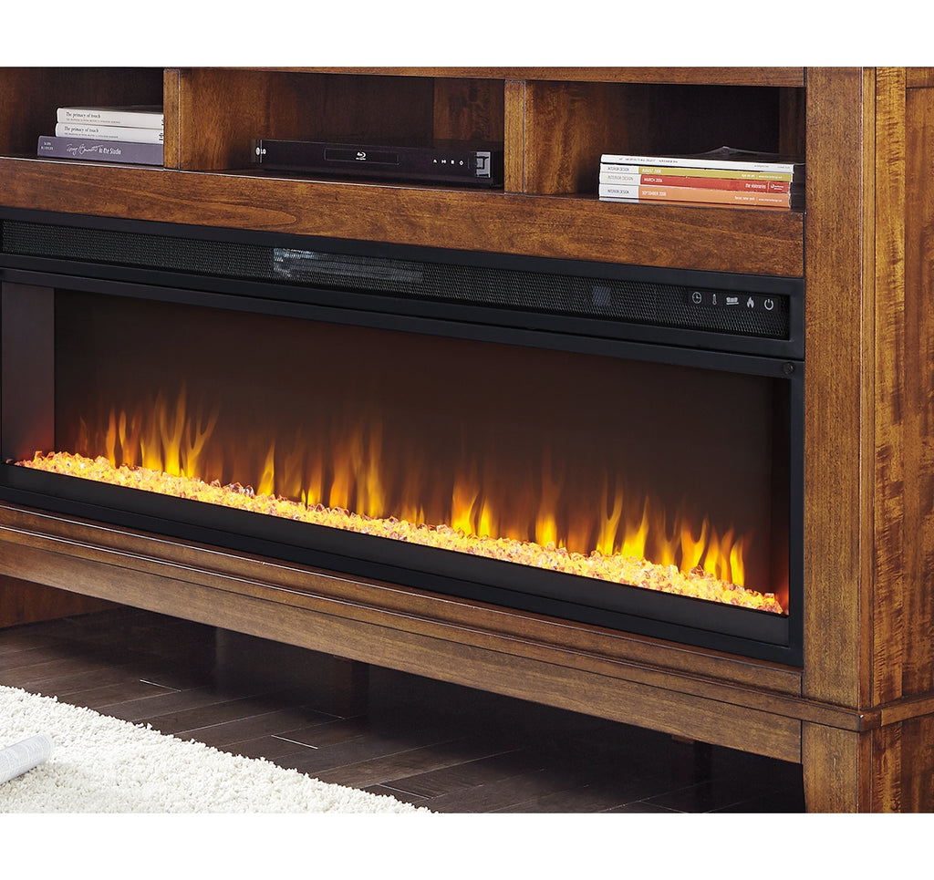 Add a touch of warmth and create beautiful ambiance for your TV viewing pleasure with this wide fireplace insert. Available as an addition on select TV stands and entertainment centers, this insert can easily replace a lower shelf in your entertainment center. With no hassle, maintenance or cleanup, delight in all the unique features of this fireplace via remote control. With the touch of a button, adjust the temperature, the color of the flame effect, or set the 12-hour timer for long-lasting enjoyment. Faux crystals enhance the flickering flame—or mix in stones for a natural touch (all included). | Product Features