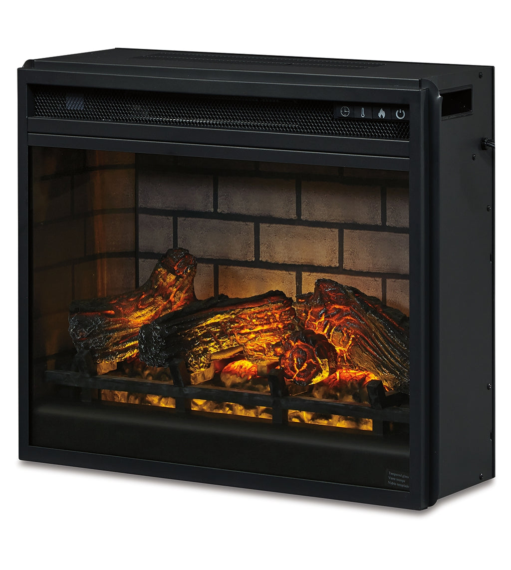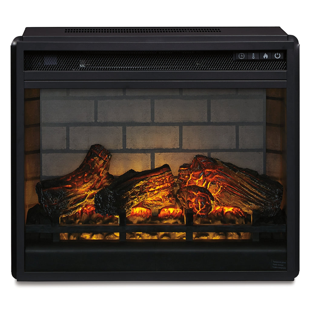 Enjoy the cozy feel of a cracklin’ fireplace without the hassle, maintenance or cleanup. Available as an addition on select TV stands and entertainment centers, this fireplace insert with faux firebrick surround operates with or without infrared heat and includes a multi flame feature, 7-level temperature setting, five brightness levels and an LED glowing embers effect. | Product Features