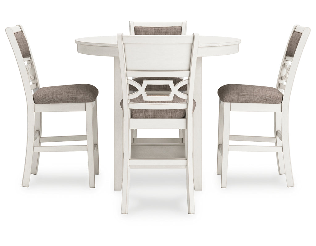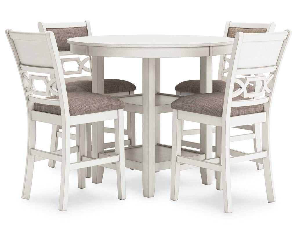 - Includes counter height dining table and 4 counter height bar stools