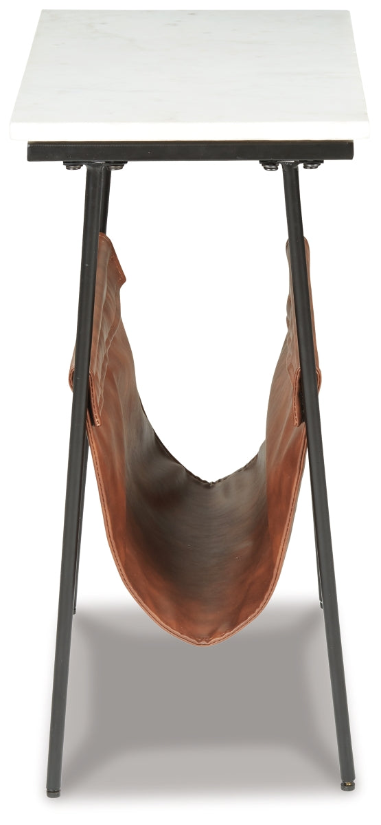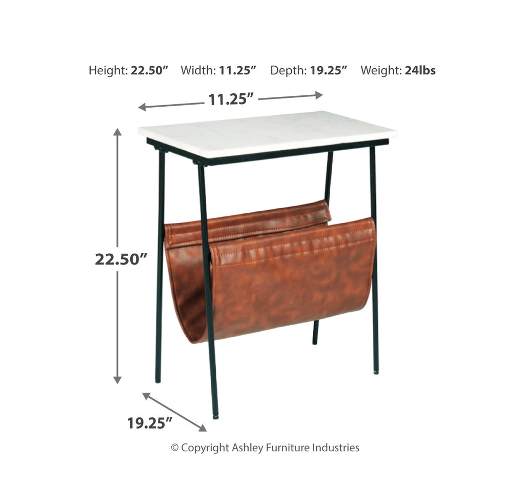 With its mixed media design, this accent table with magazine holder is what’s new—and what’s you. Fusion of black metal, white marble and brown faux leather creates a contemporary aesthetic that’s the genuine article. | Product Features
