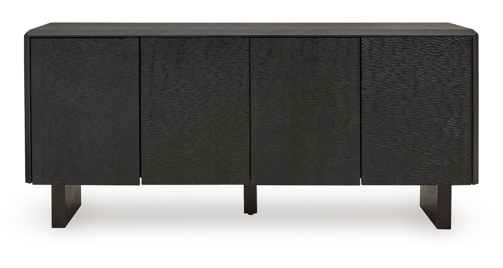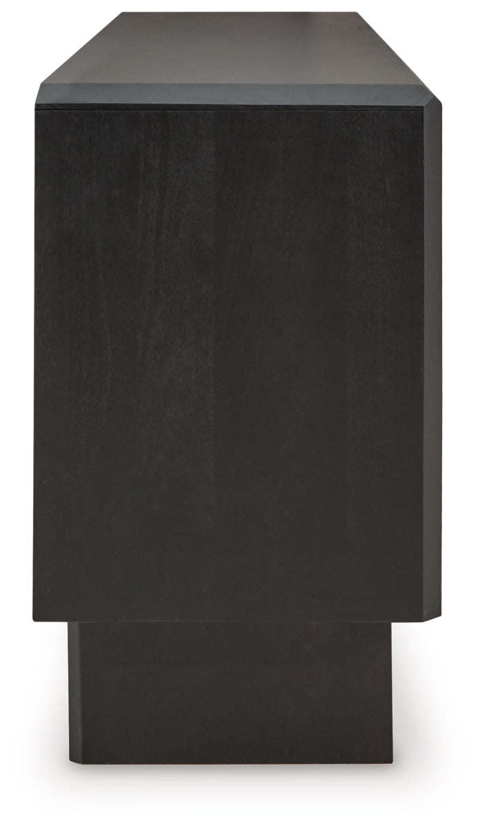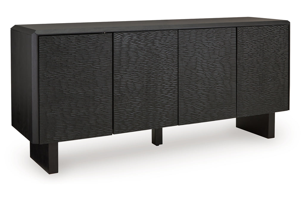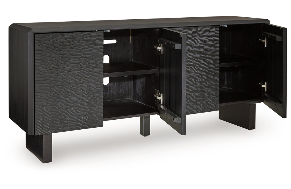 Function and style merge perfectly with this accent cabinet. Crafted of solid wood in a black finish, this piece makes a great case for fresh contemporary design. Doors with a carved pattern open to reveal shelving, while beveled edges add a distinctive touch. Whether you use it for storage or as a TV stand, your love of unique style will shine front and center. | Product Features