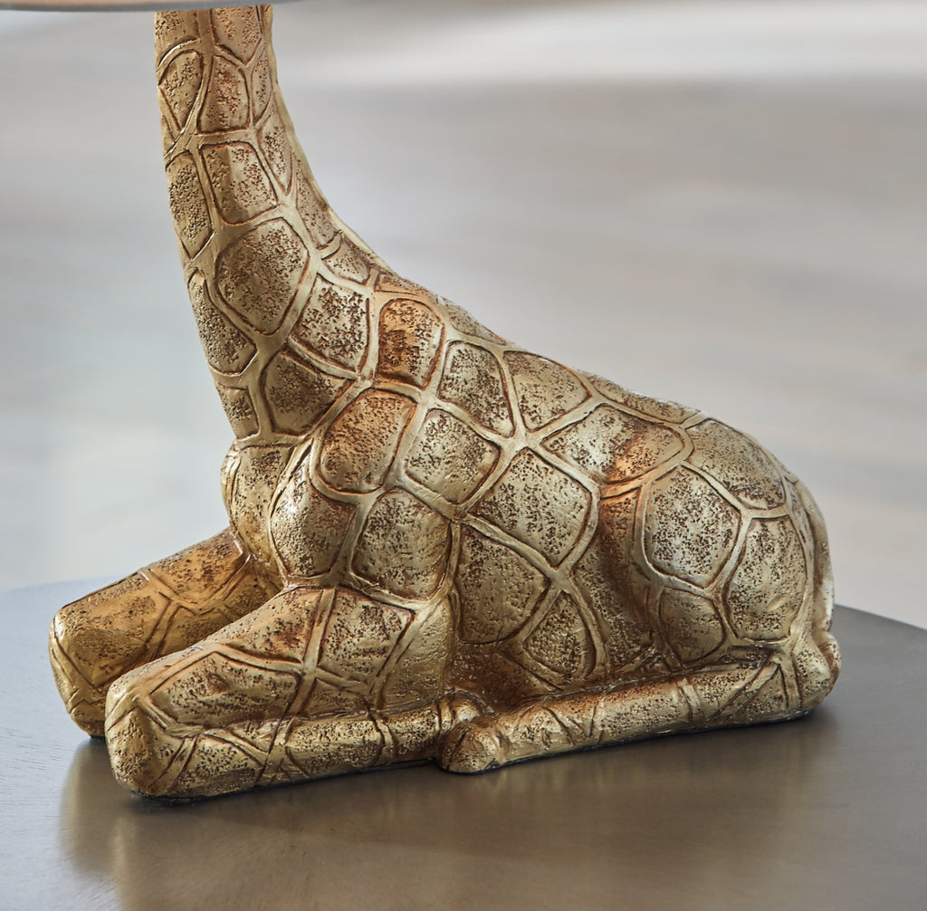 This giraffe lamp combines contemporary style with eclectic charm. The curious animal peeks out over the top of the shade, adding a playful touch to the safari-inspired vibe. For glam appeal, a goldtone finish completes the look. | Product Features