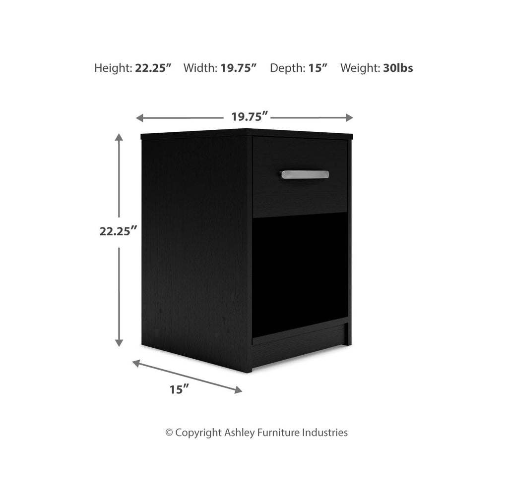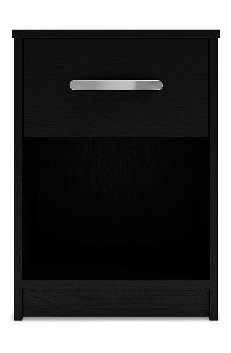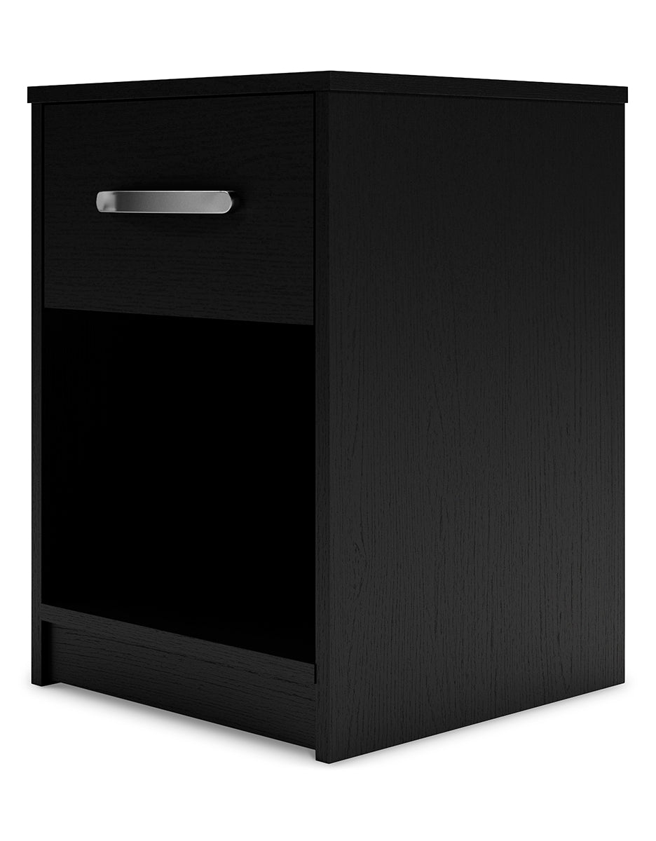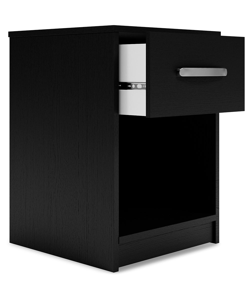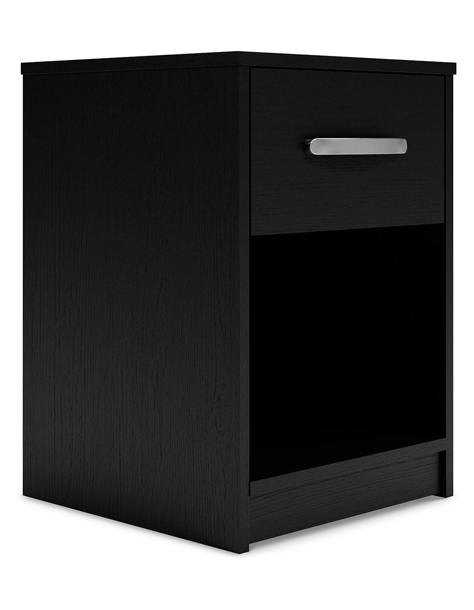 Practical and attractive, this nightstand blends seamlessly with modern decor and makes a smart addition to a bedroom. Its smooth-gliding drawer is ideal for bedside essentials. An open cubby provides a nice place for a storage basket or vase. The nightstand's curved metal pull in a brushed nickel-tone finish adds to its streamlined aesthetic. Combine with other units in the collection to create a room that’s sleek and stylish. | Product Features