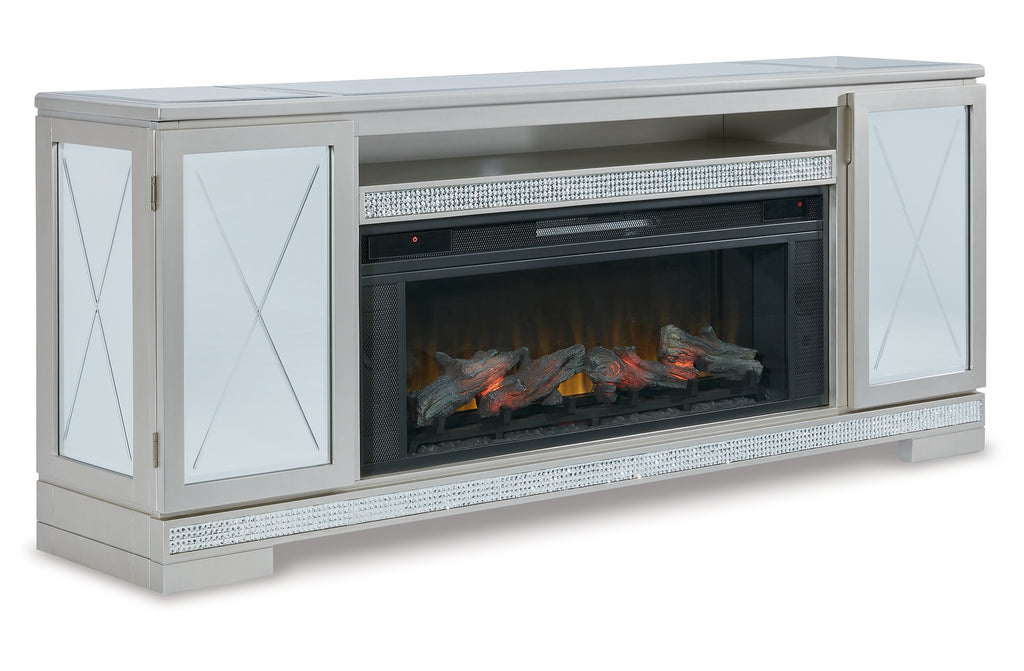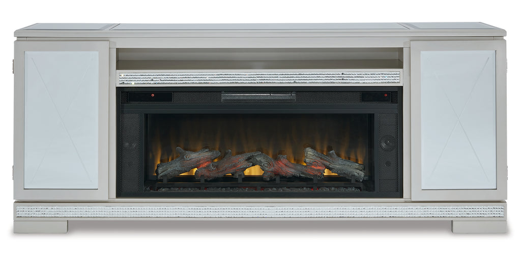 This TV stand with electric fireplace will add a contemporary touch to any room in your home. With its clean lines, this brilliant piece showcases a distinctive style for an intriguing look. The unique design is accented with inset beveled panels and a faux crystal inlay. Enhancing the experience, the fireplace insert brings a touch of warmth and beautiful ambiance to your living room. With the touch of a button, adjust the temperature and the flame brightness, and connect your device to the built-in wireless speakers. The flame effect includes a realistic-looking log set with glowing embers, along with an ambient down light. | Product Features