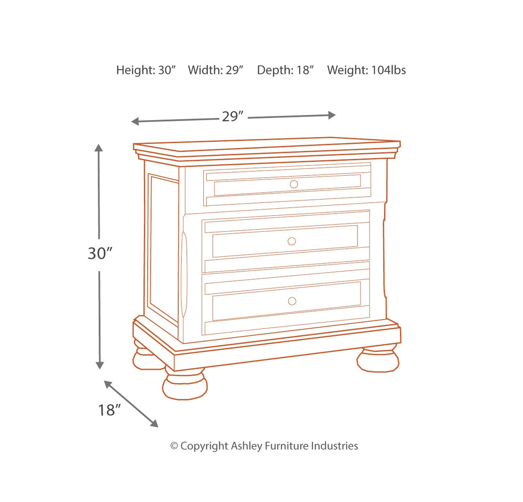 A fresh, new take on traditional style. This nightstand meets today’s design tastes with beauty and grace. Its tobacco brown finish allows the natural grain of the acacia veneers to show through in an organic way. Aged brass-tone knobs dress the fronts of the roomy drawers. A hidden pull-out tray behind the bottom drawer puts your small valuables out of sight. This is a look you can appreciate for years to come. | Product Features
