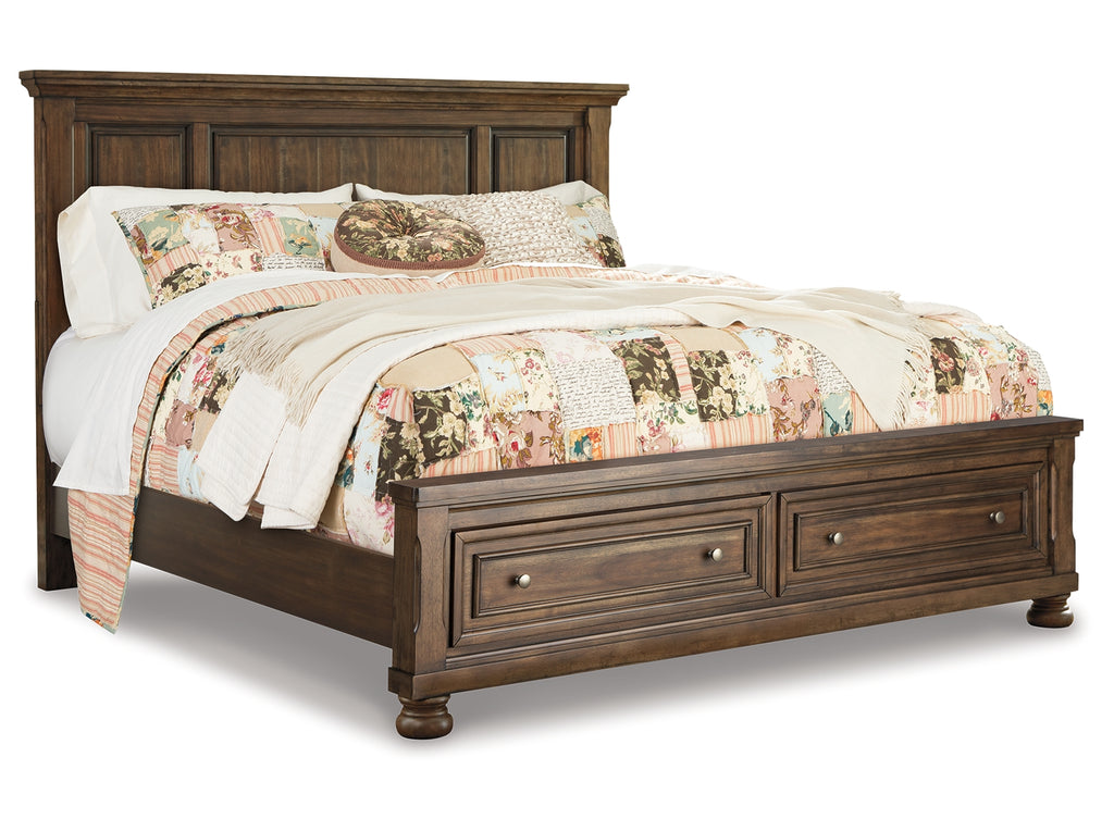 A fresh, new take on traditional style. This queen panel bed meets today’s design tastes with beauty and grace. Tobacco brown finish allows the natural grain of the acacia veneers to show through in an organic way. Aged brass-tone knobs dress the fronts of the two roomy drawers on the footboard. This is a look you can appreciate for years to come. Mattress available, sold separately. | Product Features