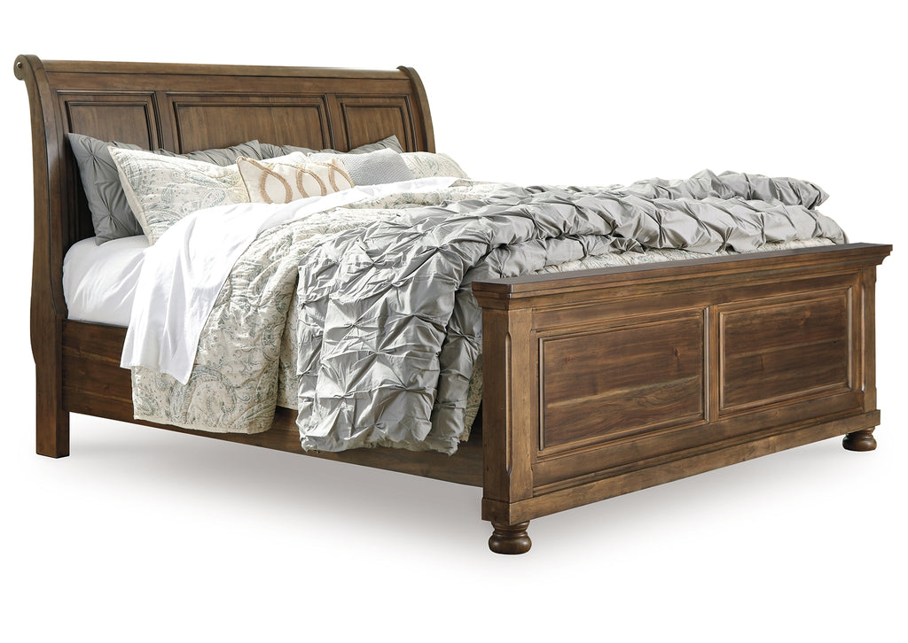 A fresh, new take on traditional style. This queen sleigh bed meets today’s design tastes with beauty and grace. Tobacco brown finish allows the natural grain of the Acacia veneers to show through in an organic way. Profiled crown moulding adds depth to the headboard and footboard. This is a look you can appreciate for years to come. Mattress and foundation/box spring available, sold separately. | Product Features