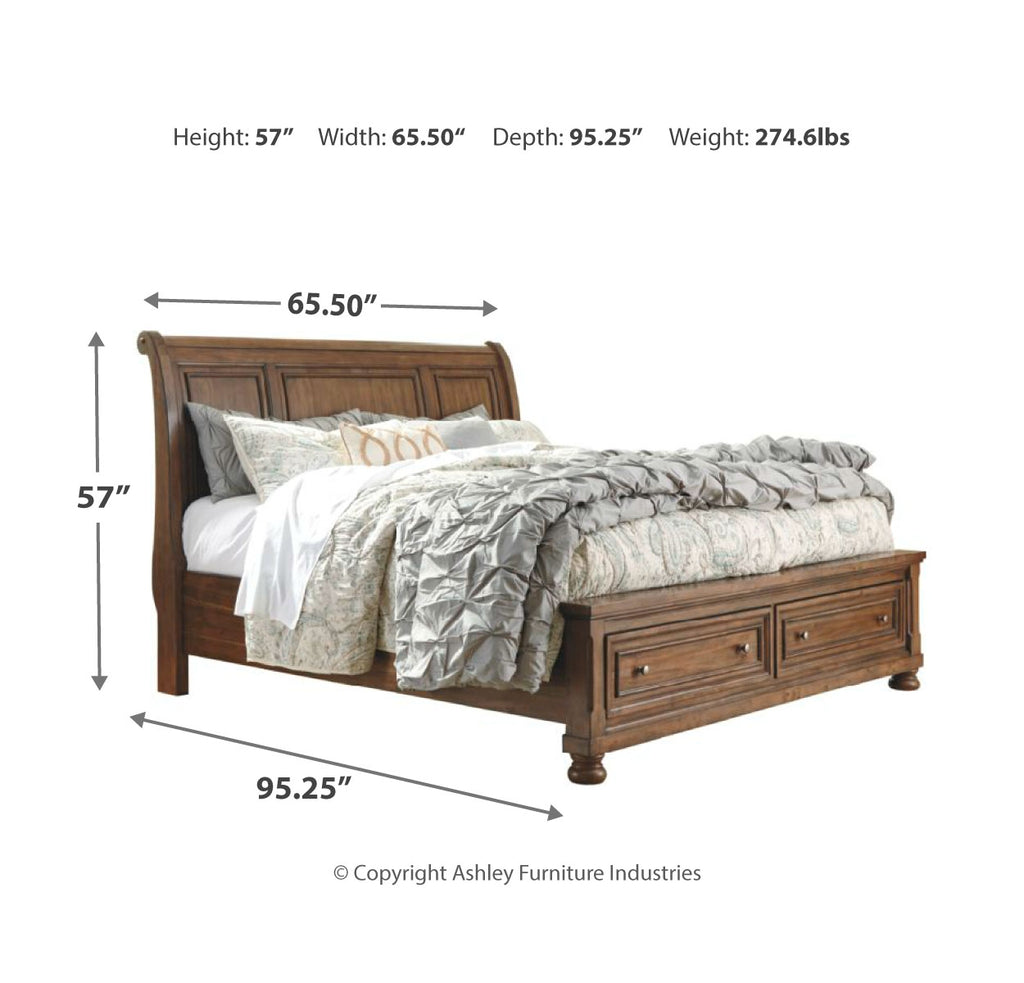 A fresh, new take on traditional style. This queen sleigh bed meets today’s design tastes with beauty and grace. Tobacco brown finish allows the natural grain of the acacia veneers to show through in an organic way. Aged brass-tone knobs dress the fronts of the two roomy drawers on the footboard. This is a look you can appreciate for years to come. Mattress available, sold separately. | Product Features