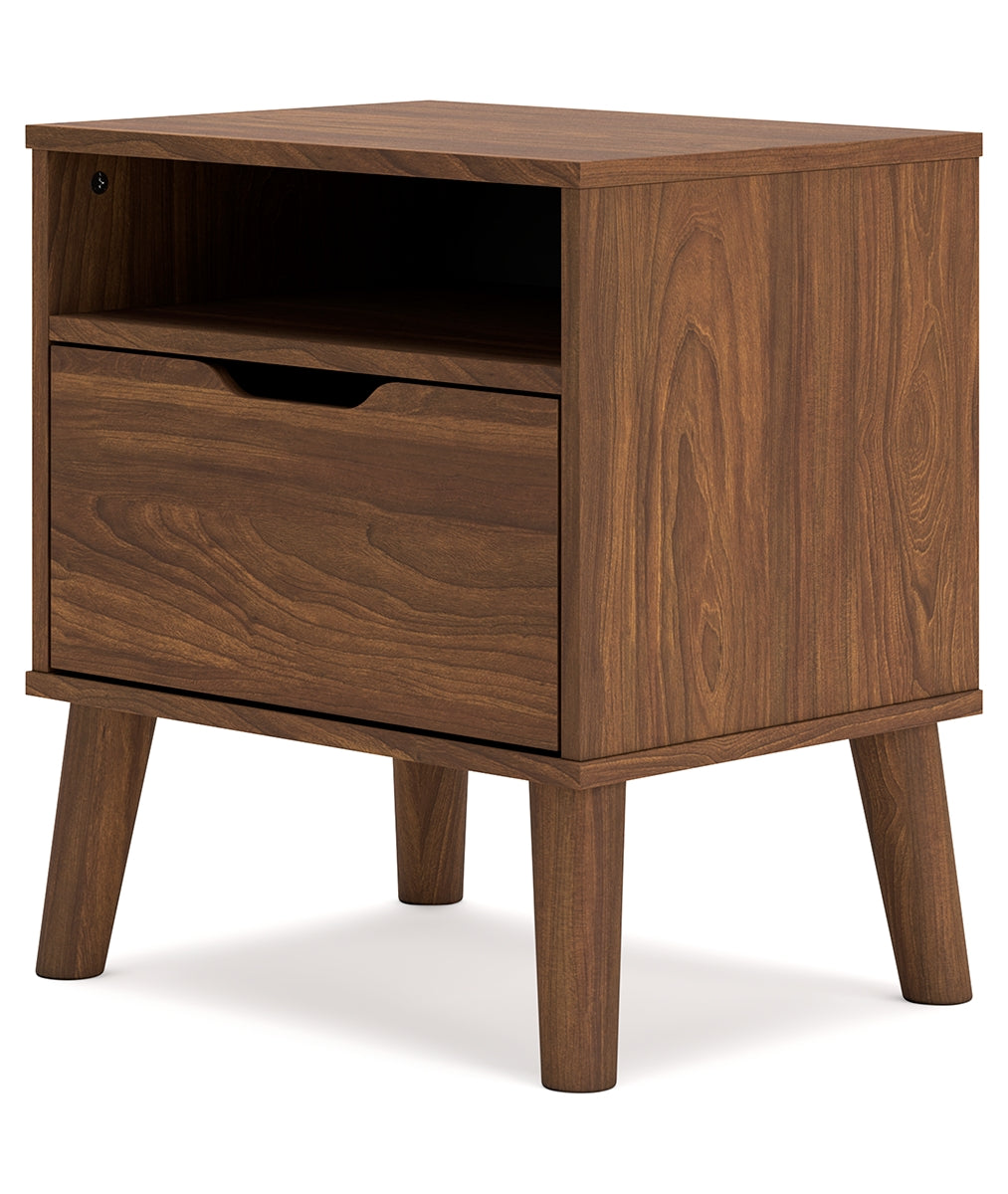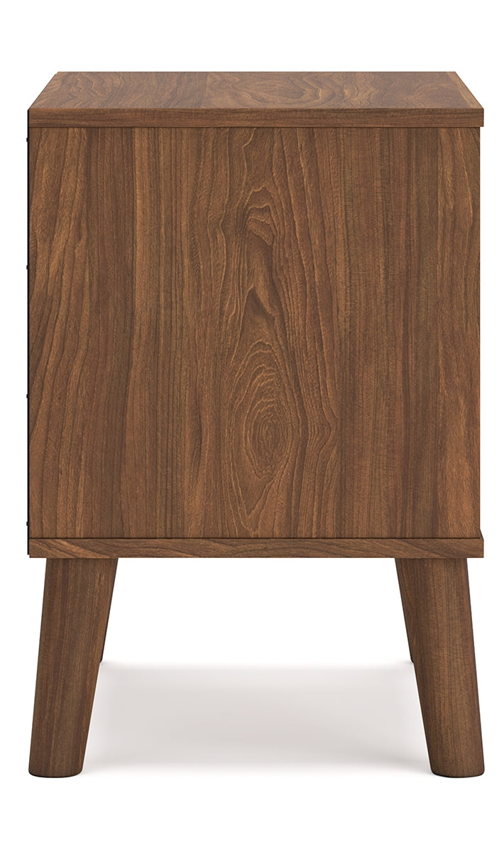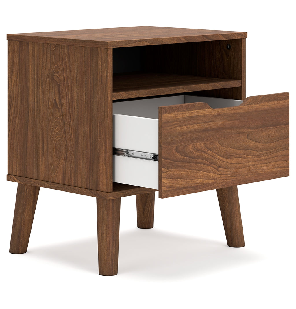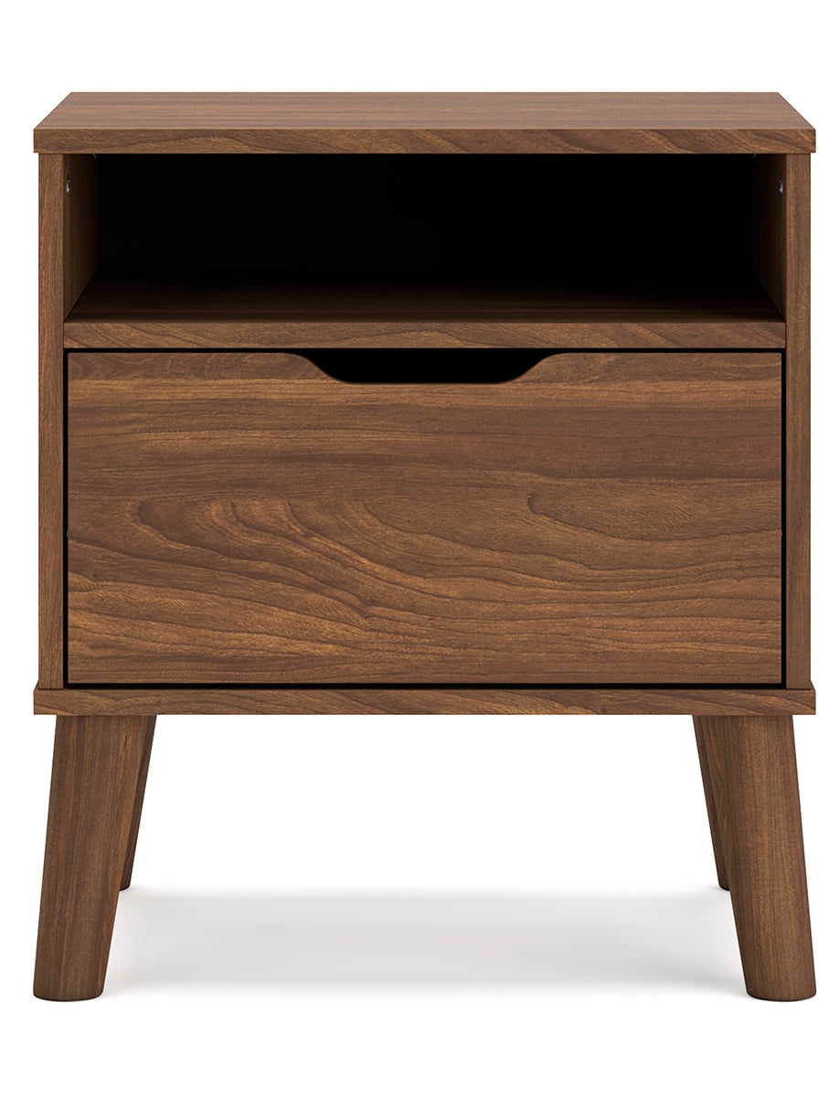 What do you get when you mix a minimalist profile with a warm finish? With sleek simplicity and a rich auburn hue, this nightstand delivers cool, contemporary style with a nod to mid-century modern design. A hardware-free aesthetic and a spacious drawer packed with bedside storage possibilities complete your restful retreat with exceptional form and function. | Product Features