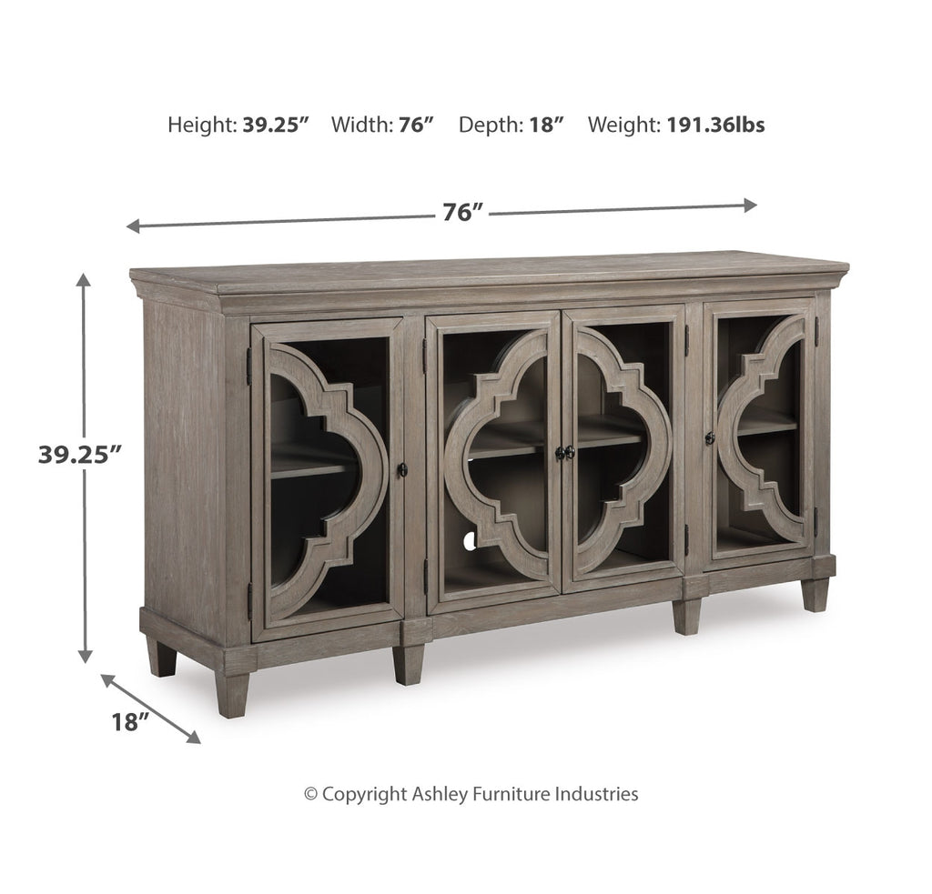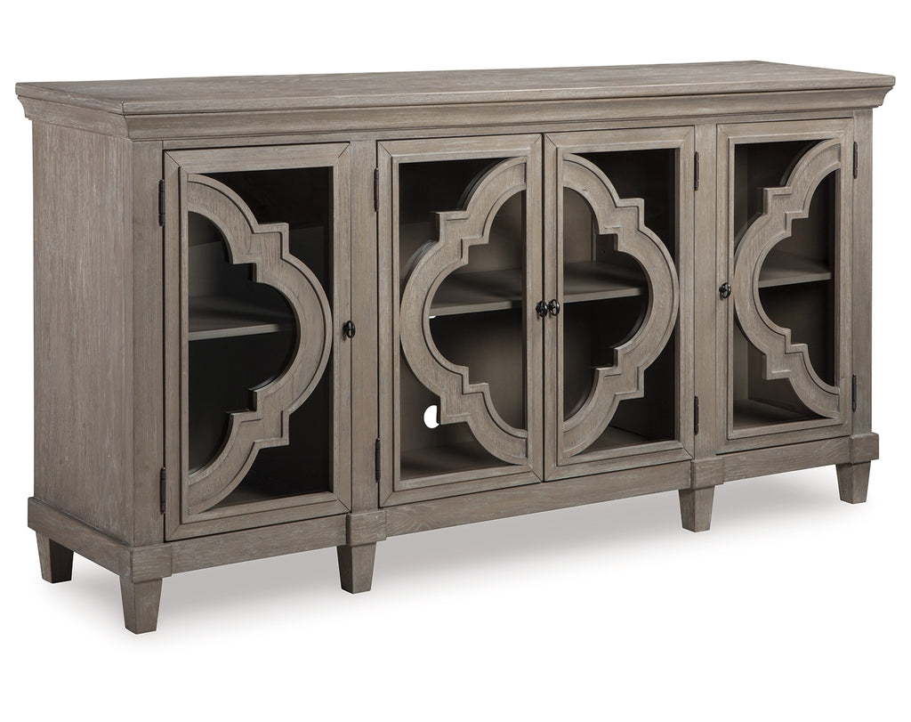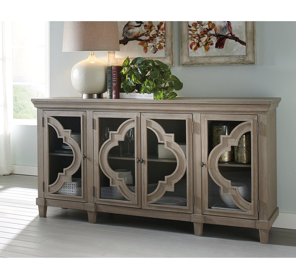 Wowing with exquisite quatrefoil framing, made all the more dramatic with the contrast of clear glass, this 4-door cabinet serves up an easy-elegant aesthetic sure to satisfy. The light and lovely finish brings a relaxed sensibility to the scene. | Product Features