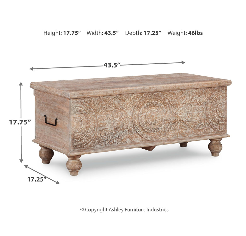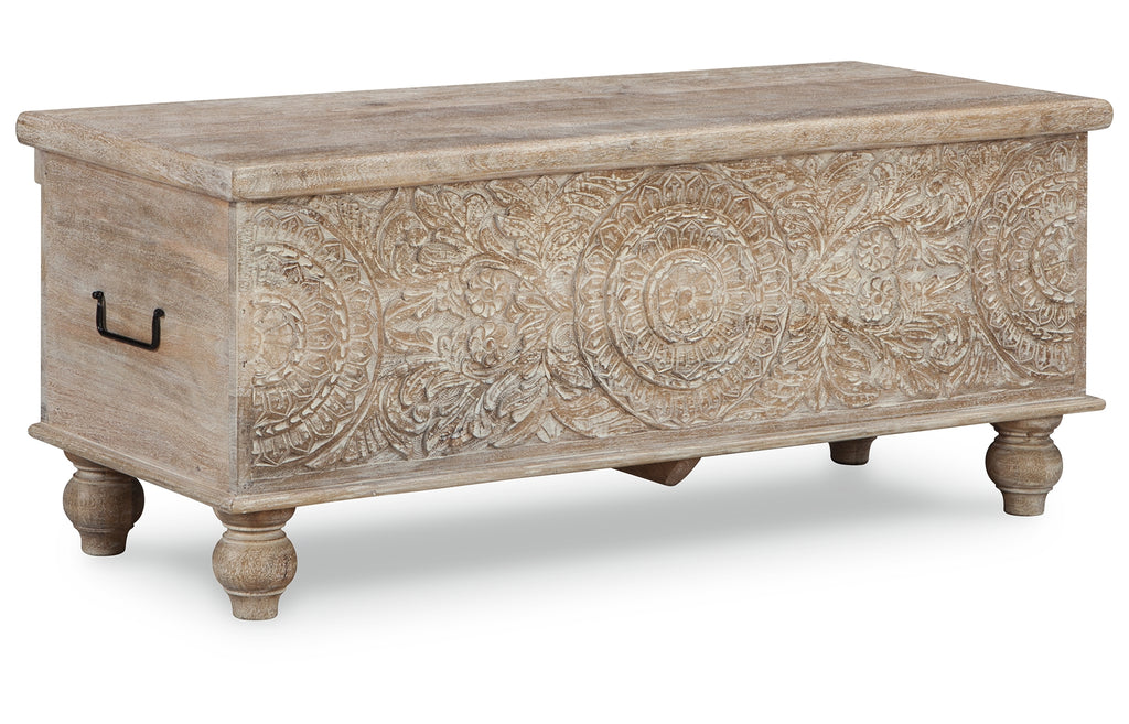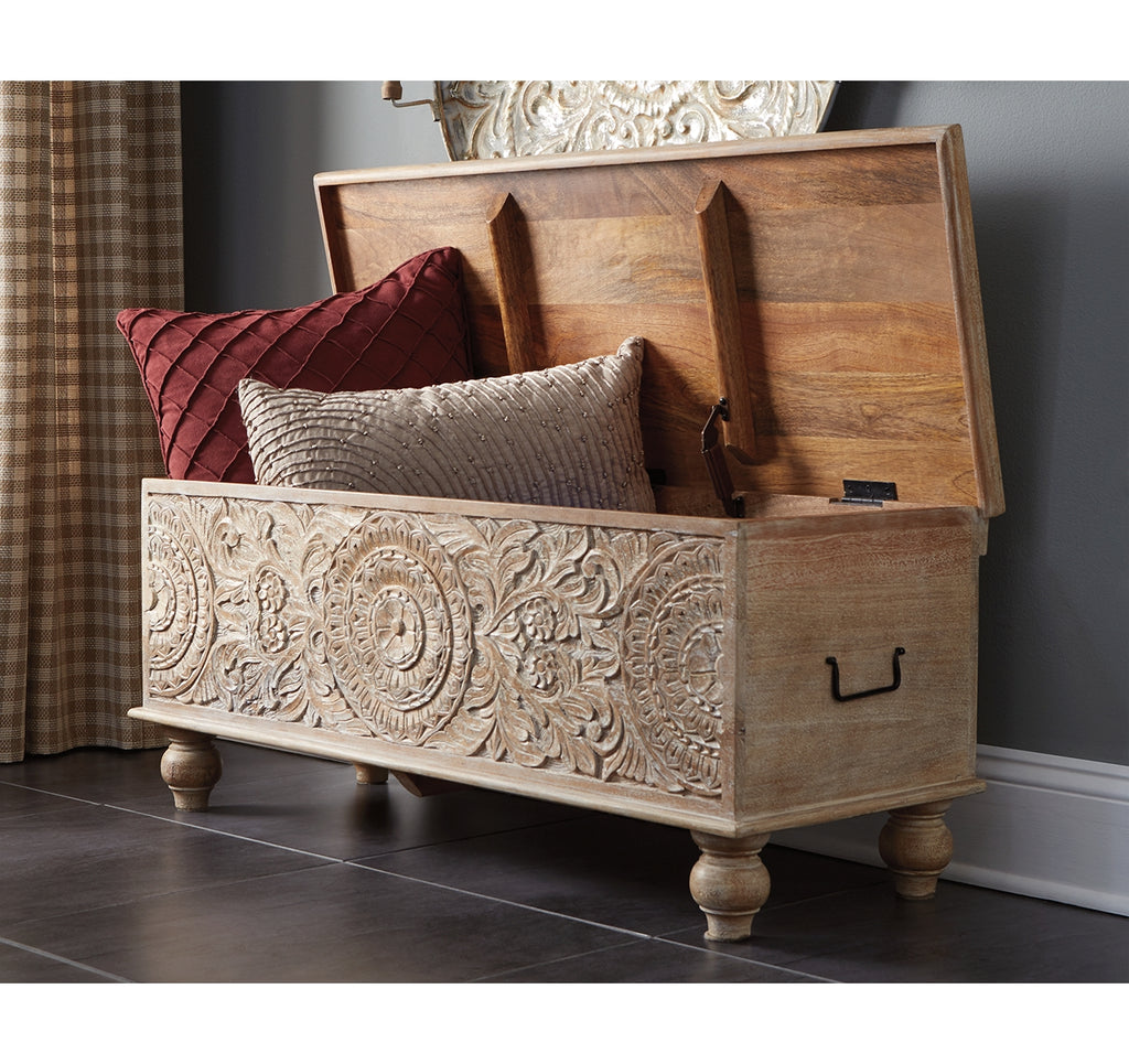 Merging practical storage with an exotic sense of flair, this storage bench stands out from the crowd in an intriguing way. Its grainy wood is beautified with an antique white finish, and the ornamental medallion carvings are pure artistry. | Product Features