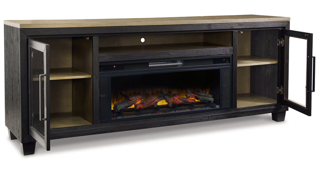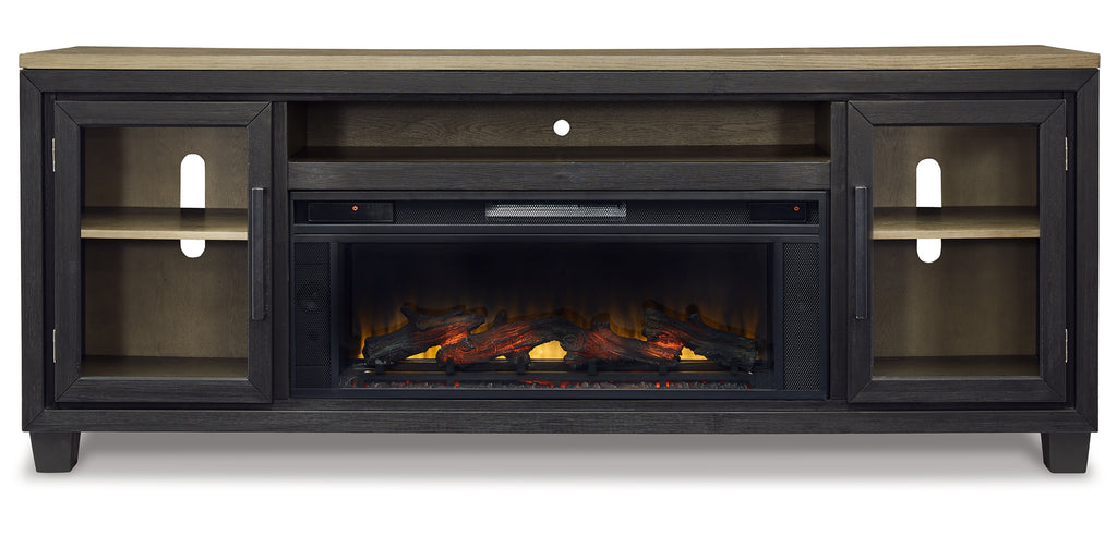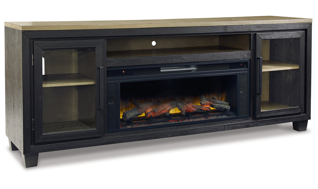 This TV stand with fireplace is rustic, casual contemporary style simply done right. Its two-tone color scheme features a rich brushed black finish accented with a dusty grayish brown wood tone. With two glass-front cabinets (each with an adjustable shelf), an open cubby and a removable center shelf, it offers plenty of storage to house all of your electronic needs. For added viewing pleasure, the electric infrared fireplace insert brings the cozy feeling of a fireplace without the work or worry. It's just the thing for a perfect night in. | Product Features
