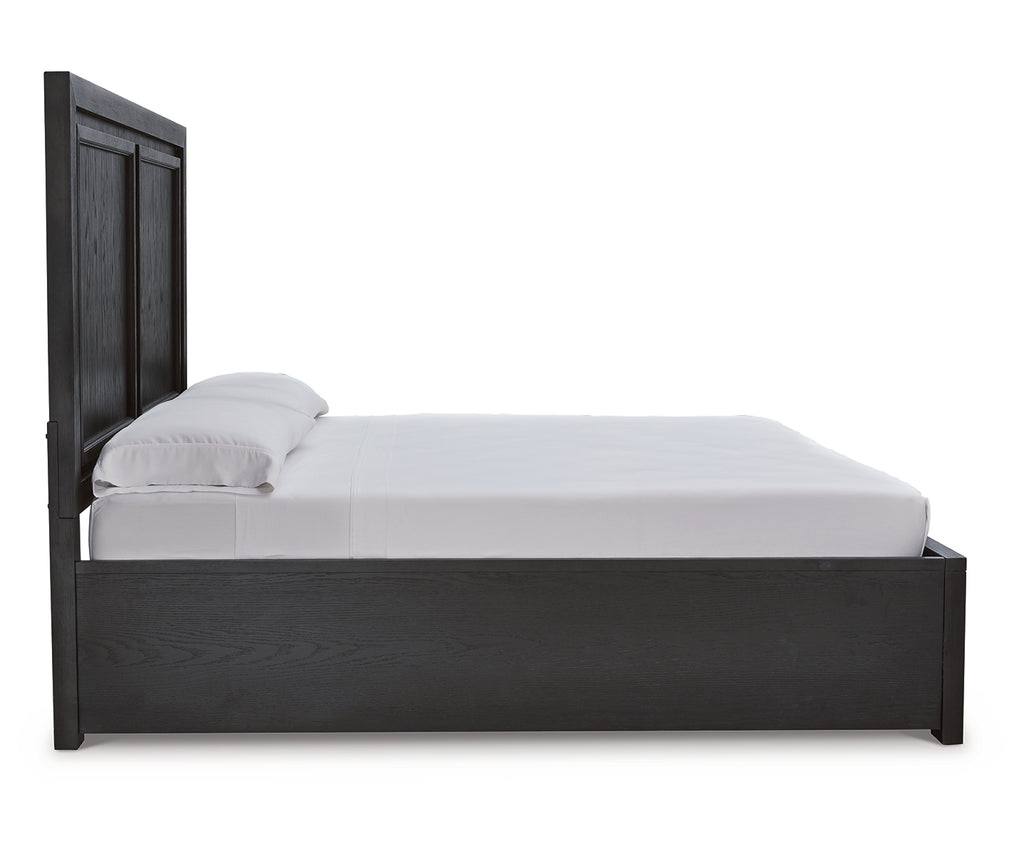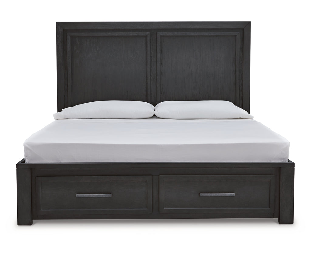 Includes king panel headboard, storage footboard, and rails with roll slats
