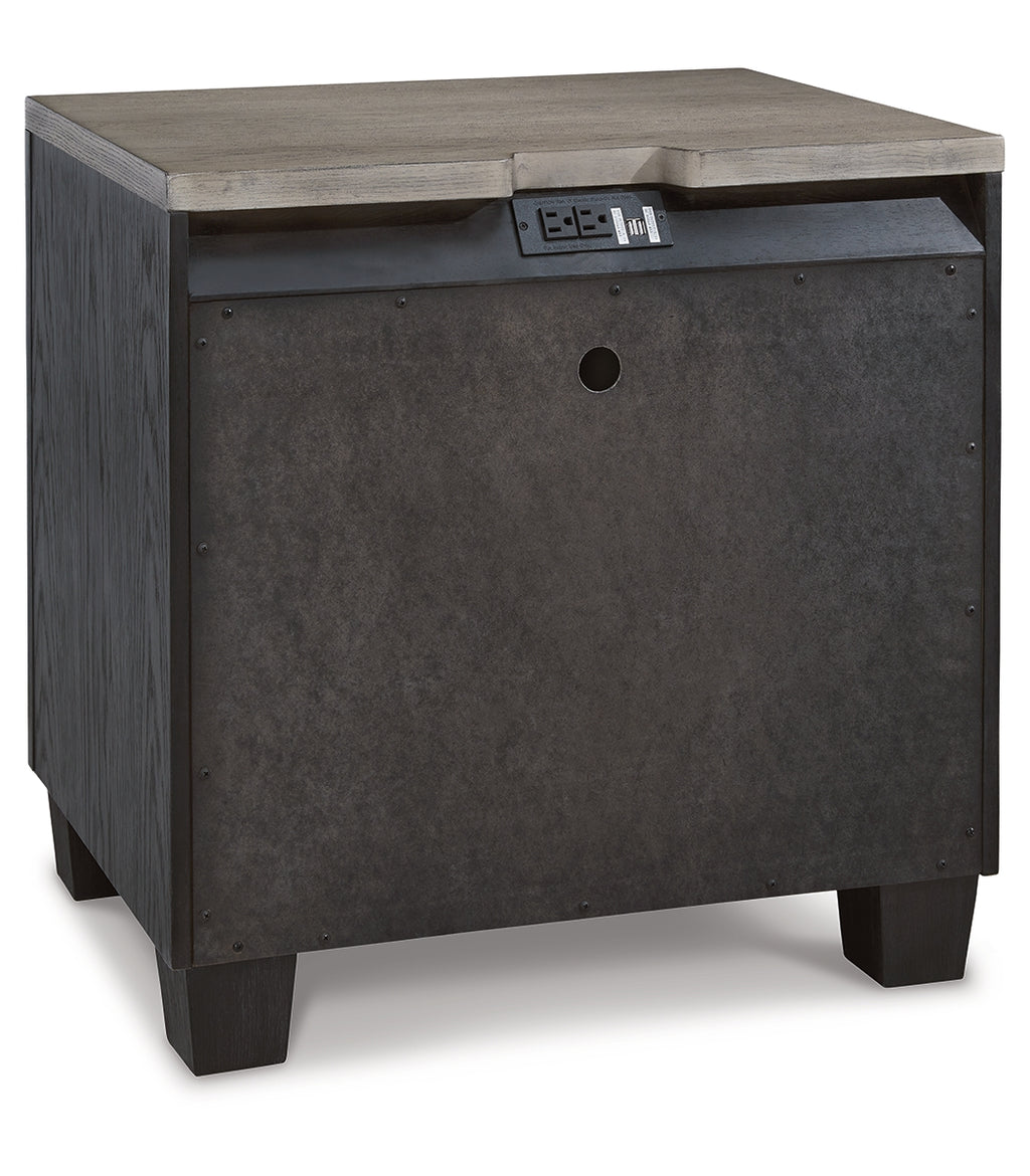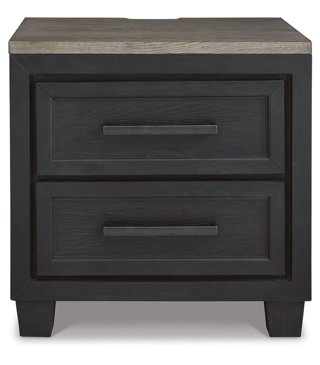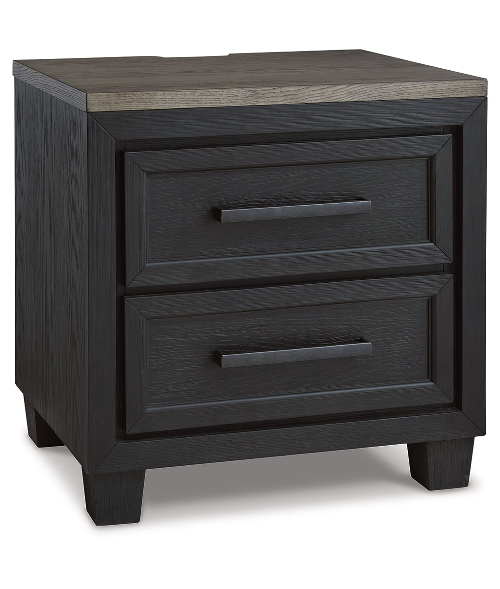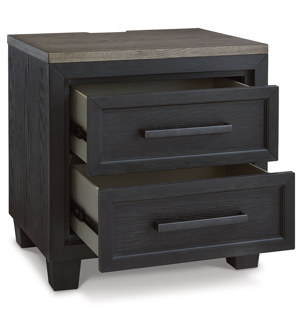 This nightstand is casual contemporary style simply done right. Its two-tone color scheme features a rich brushed black main color accented with a beautiful dusty grayish brown wood tone. Two drawers with sleek black pulls offer plenty of storage for your bedside essentials. The nightstand marries tech and clean-lined design, with a dual USB charging port along the upper back edge to keep your devices powered all evening long. | Product Features